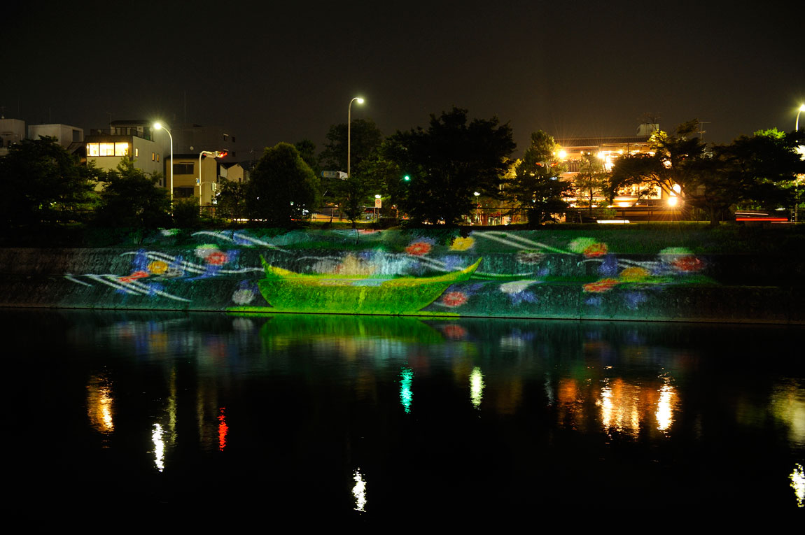 The Kamo River site—a broad river walk area that is popular throughout the year—becomes a celebration of light, sound, and even scent, as incense is placed at different locations along the river, and projection mapping turns the wall opposite the river walk into a screen that is visible while you walk or from the many restaurant terraces that look over the river.