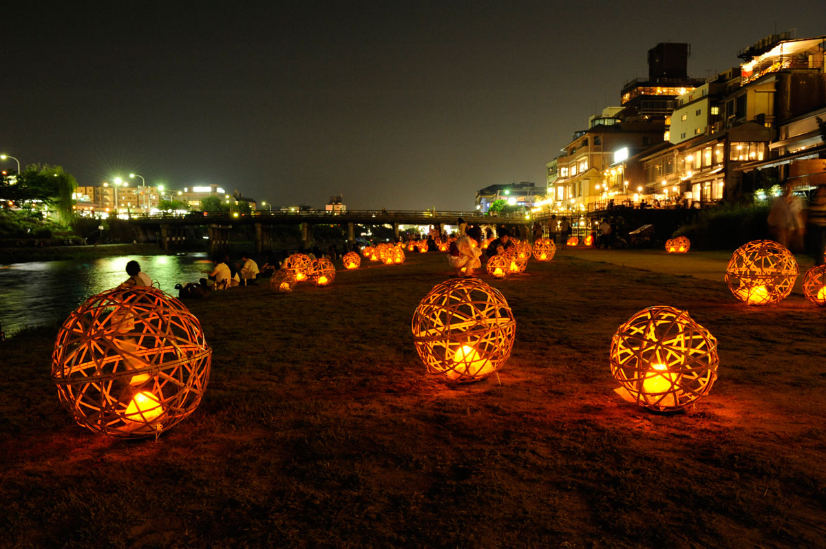 Traditionally, Tanabata is celebrated with a variety of decorations: streamers in bright hues, prayers written on colored pieces of paper and tied to bamboo leaves, and women wearing yukata of all shades. But the former capital has always been one to do things its own way, and the city’s unique approach to Tanabata, which it celebrated in the beginning of August in Kyoto, recalls the heavenly origins of the festival, and brings a little of the River of Heaven (or as we like to call it in English, the Milky Way) down to earth. Over the span of ten days, the areas by the Kamo and Hori Rivers come to life during the night.