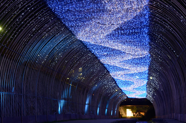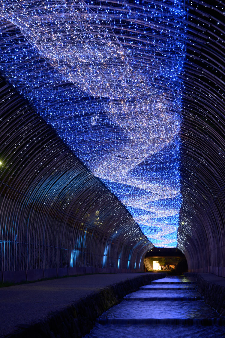 At the Horikawa (Hori River) site, you can walk under a depiction of the Milky Way, made from LED lights that are attached to an arch of bamboo. As this part of Kyoto has long been a center of Yuzen silk manufacturing, you can also find long streams of embroidered silk floating on the surface of the Horikawa, depicting constellations and other scenes that represent the night skies above.