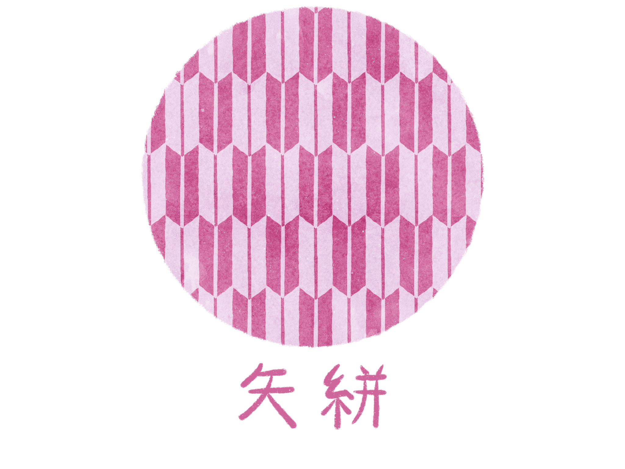 This wagara is inspired by archery fletching, the directional feather tips attached to arrows. During Oshogatsu (New Year) celebrations, decorative arrows called hamaya are sold at shrines and temples as lucky charms to ward off evil spirits and protect the family home. In the same manner, yagasuri is said to bring protection and good luck.