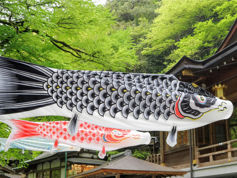 Families traditionally fly colorful koinobori banners (or carp-shaped flags, if you prefer) for each child in their house. In Japanese folklore, the carp is a symbol of determination and vigor, overcoming all obstacles to swim upstream. Samurai warrior figurines and samurai kabuto helmets can also be displayed in homes to inspire strength and bravery.