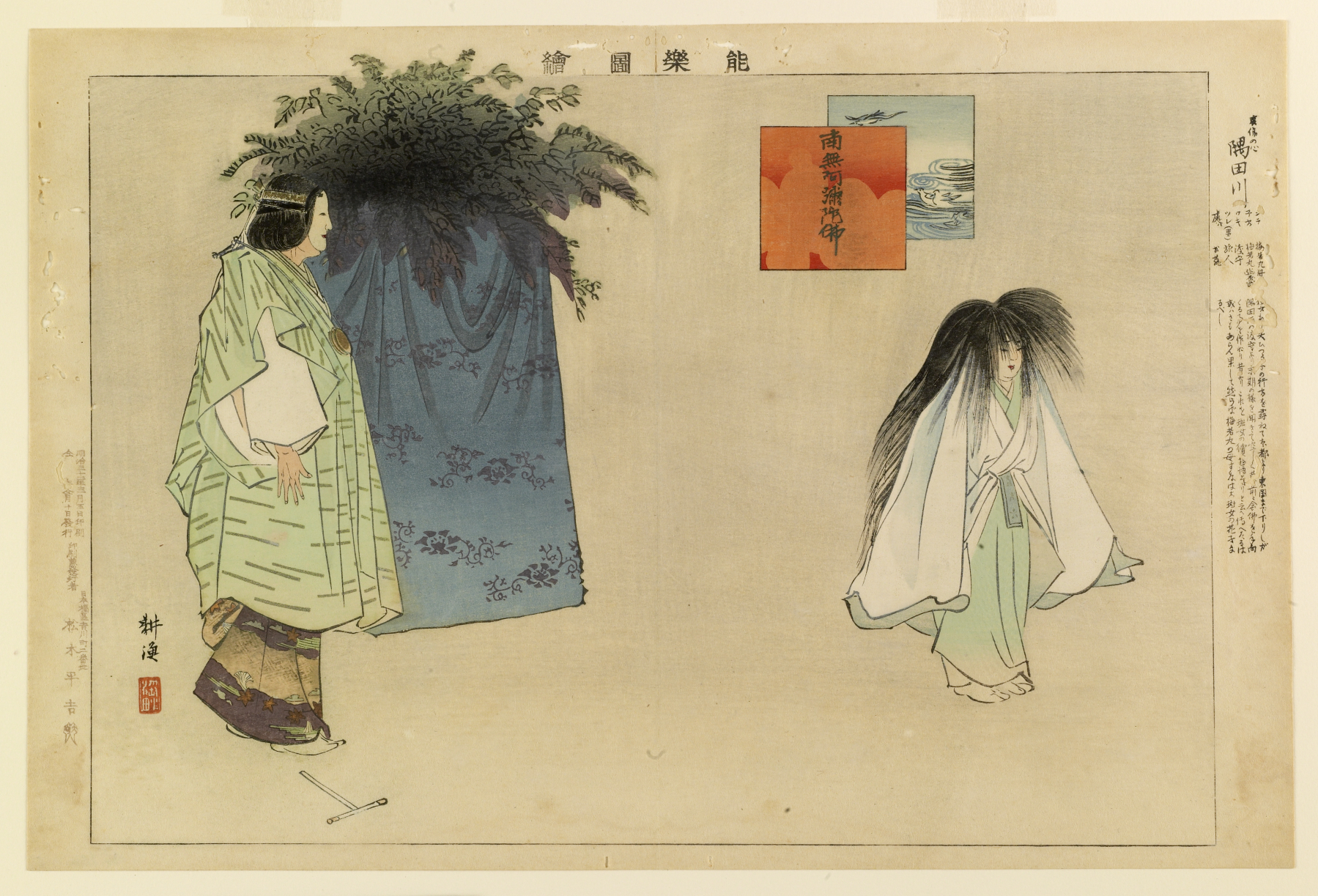 Kanze Motomasa’s 15th century tragic noh masterpiece, Sumidagawa, is a play that, with stark and mystical simplicity, tells the final chapter of a mother’s search for her missing son. Frantic in her concern, the mother travels on foot from Kyoto to Musashi province, the site of current day Tokyo, where she finds herself by the banks of the titular river. Guided by the boatman with whom she makes a fateful ferry crossing, she attends a somber moonlit ceremony in a secluded place, where at last her agony of uncertainty is met with an answer. Neither the mother’s story nor the play has a happy ending.