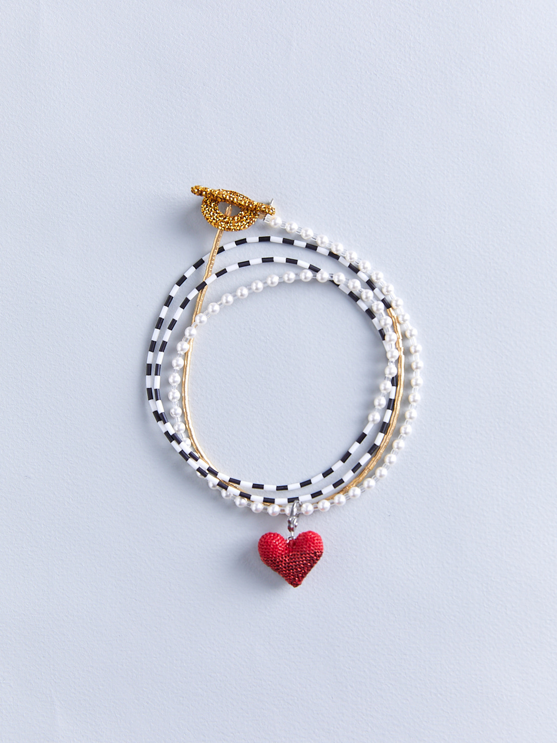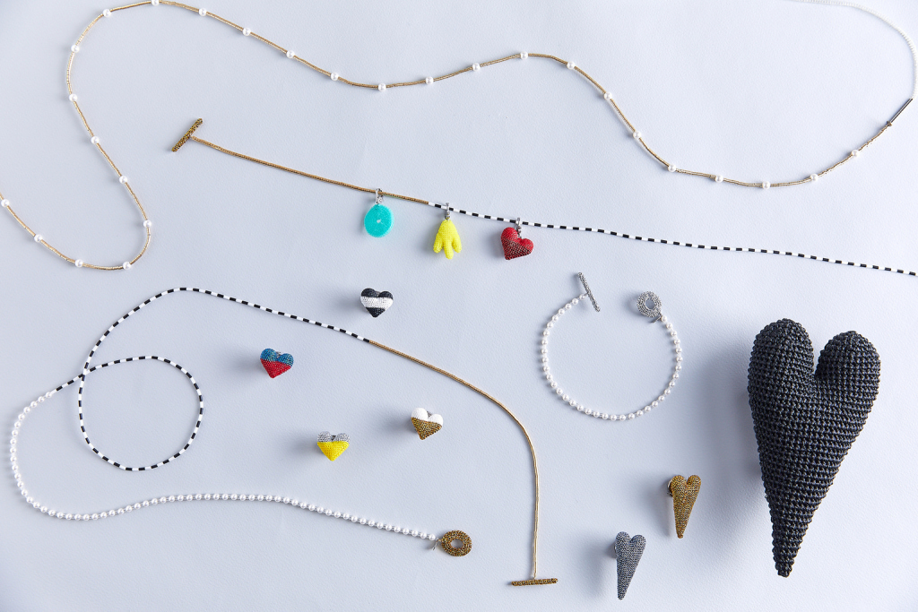 Can’t choose between a bracelet and a necklace? Get both by buying this single item. New in the mm collections, this bracelet and necklace combines knitted and jewelry parts and can be adjusted in as many ways you wish! The charm is sold separately. Knitted parts bracelet or necklace ¥10,500,  Knitted heart charm ¥7,500. Buy here.