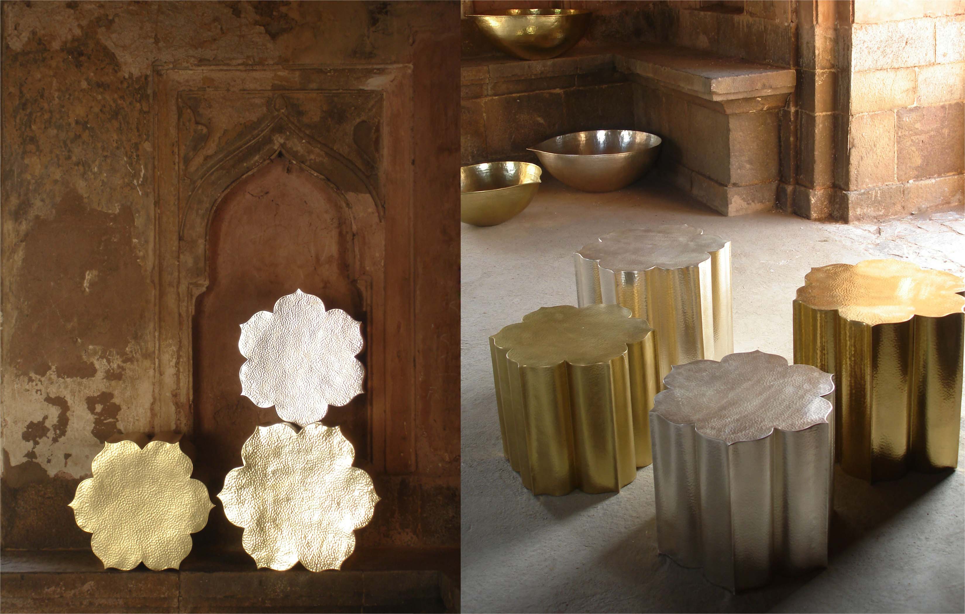 These beautiful beaten brass stools are created by design experts Vikram and Divya Goyal of Viya home. The sculptural, lotus flower-inspired shape means that they can be used as both art and seating. Take the designers’ advice and pair them with old wooden furniture pieces, fossil stools or tribal benches.