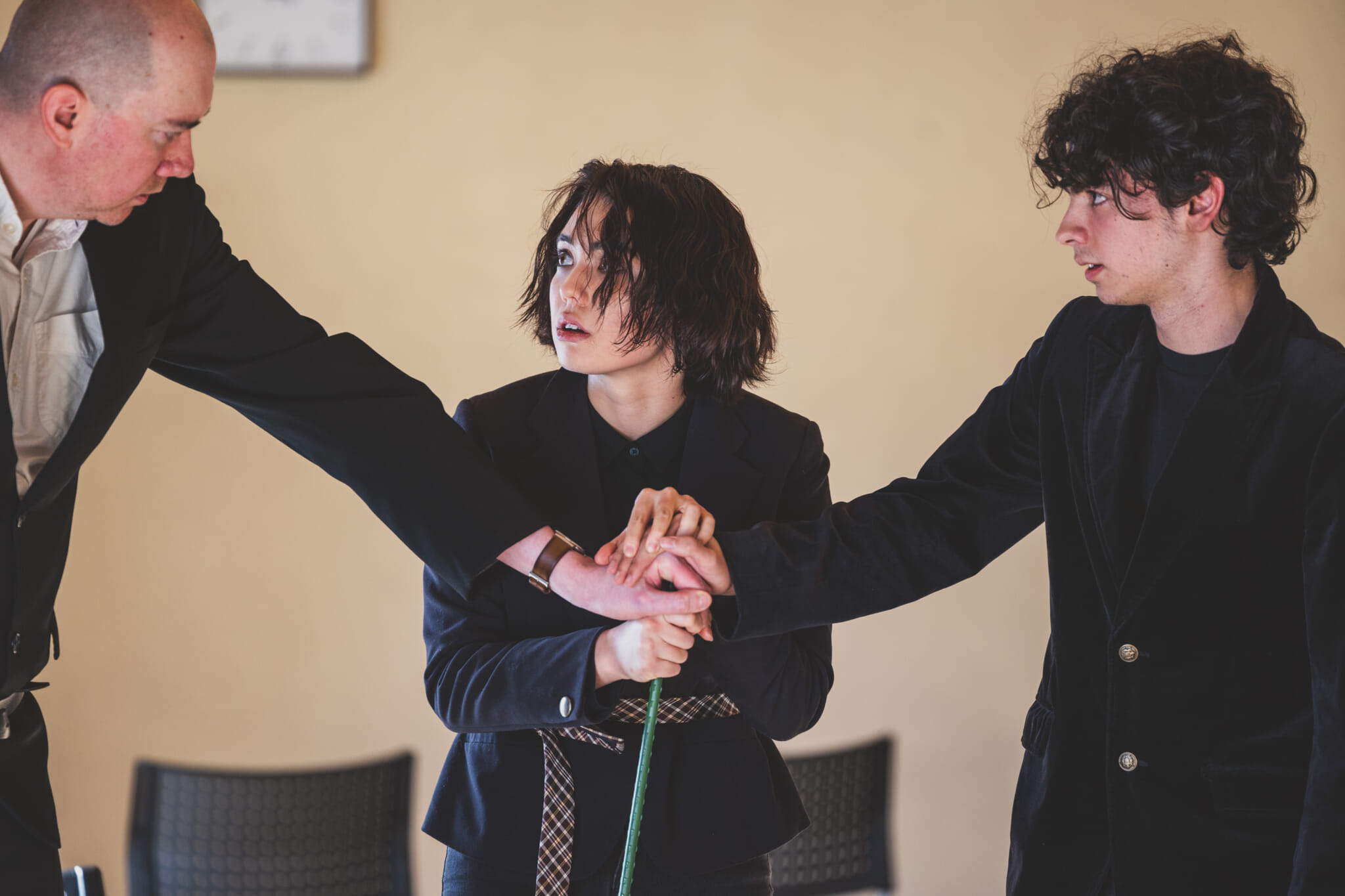 In terms of the costume and set design, they’ve incorporated a twist on the classic. “The costumes are anchored in a Renaissance base, but it’s colored with 50s and 60s design,” Walker explains, “I wanted to look at the divide between the older generation and the younger generation. The older generation has that more conservative, post-war strictness, and the younger generation are more in the 60s, dressing more freely.” In contrast, the set reflects Denmark’s stony cityscape. “We have a brutalist set that’s gray, muted and rigid, that reflects the world of Hamlet. But we also have some falling fabric to incorporate softness. Because we have really interesting and colorful costumes, we didn’t want that to clash with the set.”
