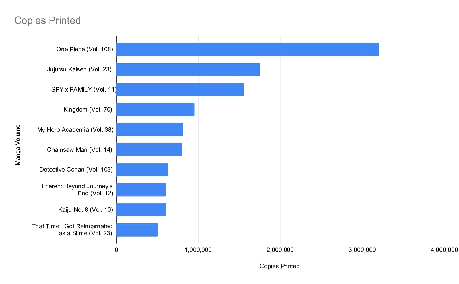 To no one’s surprise, One Piece continued to lead the charge as the most popular and successful manga series. There were more than 3.2 million copies of the first print of Volume 108 of Eiichiro Oda’s pirate manga. The second and third places overall also belonged to manga behemoth Shueisha, with 1.75 million first print copies of Jujutsu Kaisen Volume 23 and 1.55 million copies of Spy x Family Volume 11. Kingdom, My Hero Academia and Chainsaw Man all achieved prints above 800,000 copies. It shows that the public’s appetite for battle and shonen manga is truly insatiable.