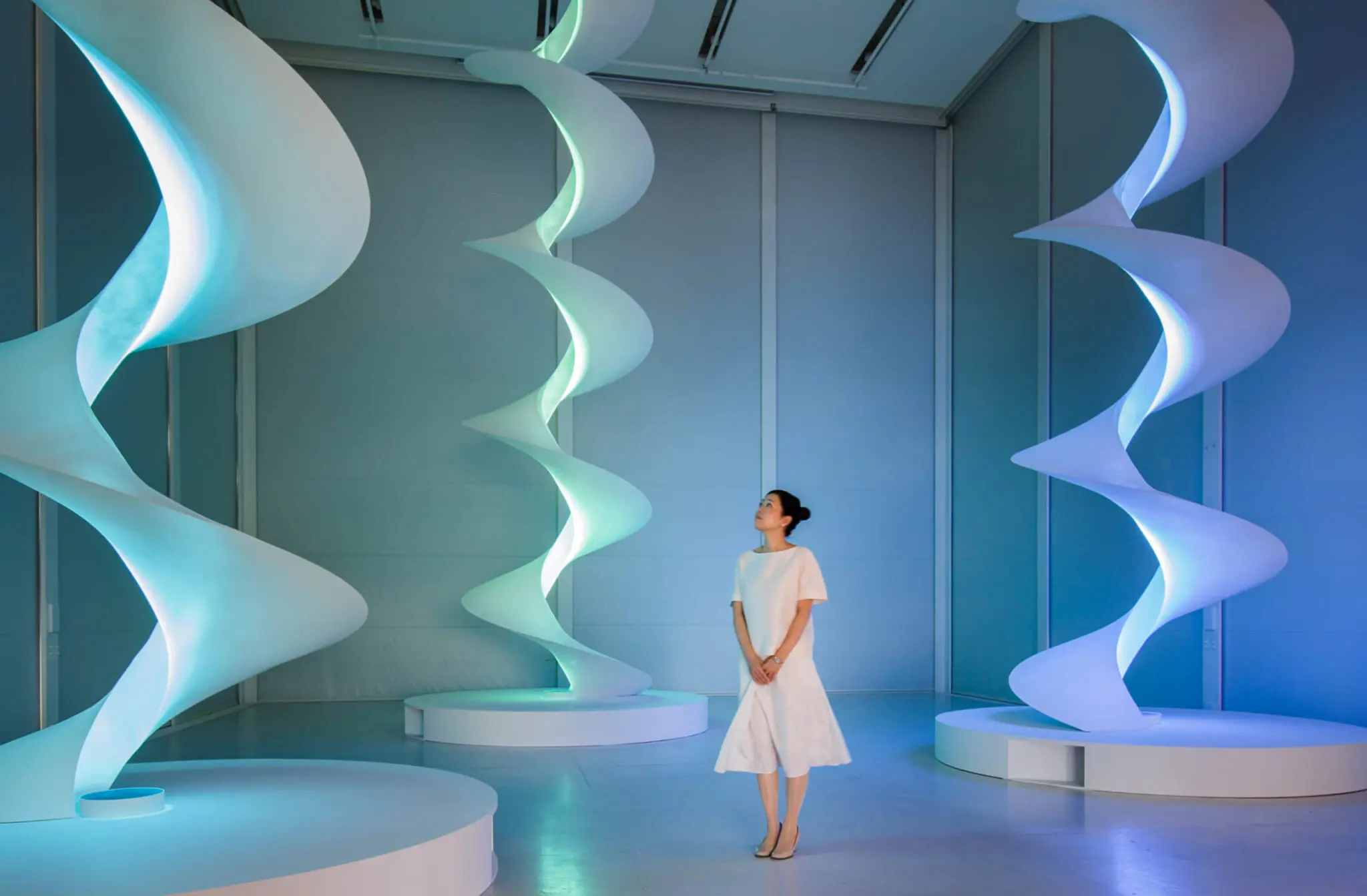 For her permanent installation on Japan’s art island of Teshima, placed there in 2011, she joined forces with Japan’s Institute for Cosmic Ray Research to create “Tom Na H-iu,” which she completed in 2006. Ten years later, Mori’s sculpture series “Cyclicscape” focused on Mobius strips, elegantly twisting and twirling. This was designed using 3D printing, a technology Mori embraced when it came out and still utilizes today. “Technology is the tool to realize an idea,” she says.