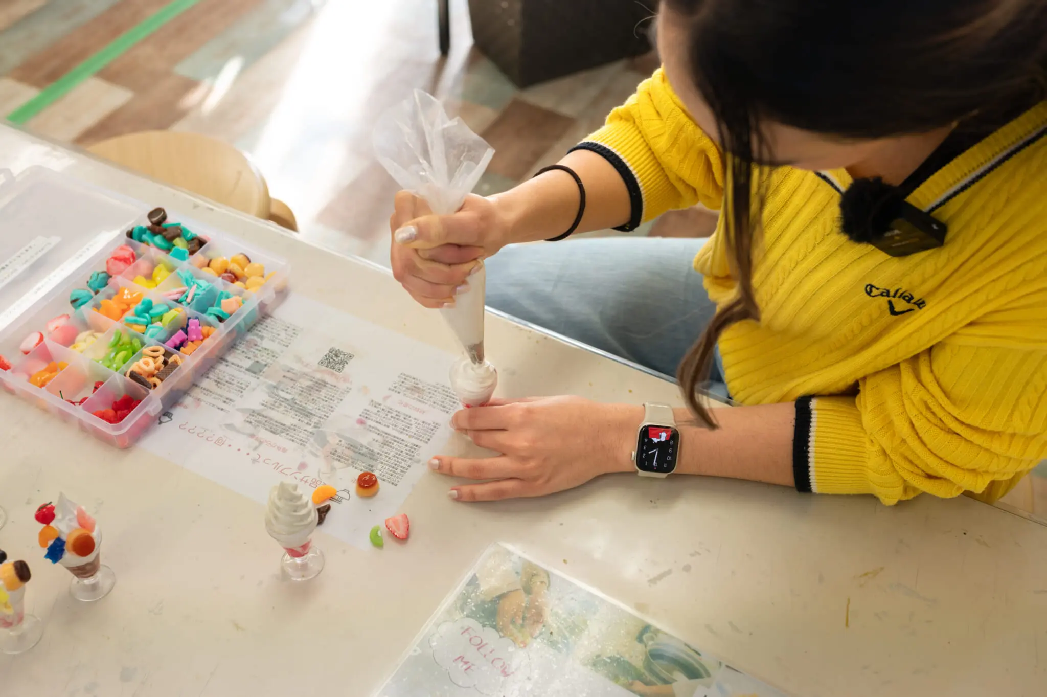 I chose the pre-made toppings I wanted to put on my parfait (the hand-painted strawberry and tangerine slice were a must), and practically didn’t breathe as I piped the silicon on top. After piping, the surface of the cream solidifies in five minutes, so you have to act fast to lay out your decorations. The silicon takes a full day to fully set, but after those initial heart-racing minutes, the cream mostly won’t budge unless you poke or drop it.