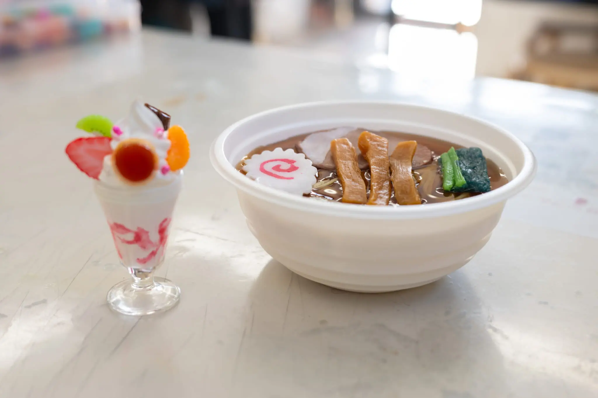 Visiting Yamato Sample myself, I made ramen and a mini parfait. Most of the ramen’s components were made of wax, except the green onions, which were made of PVC, and the soup, which was made of gelatin. Because wax is malleable, the noodles and toppings are placed in warm water to manipulate them, which feels weirdly similar to the act of cooking real ramen.