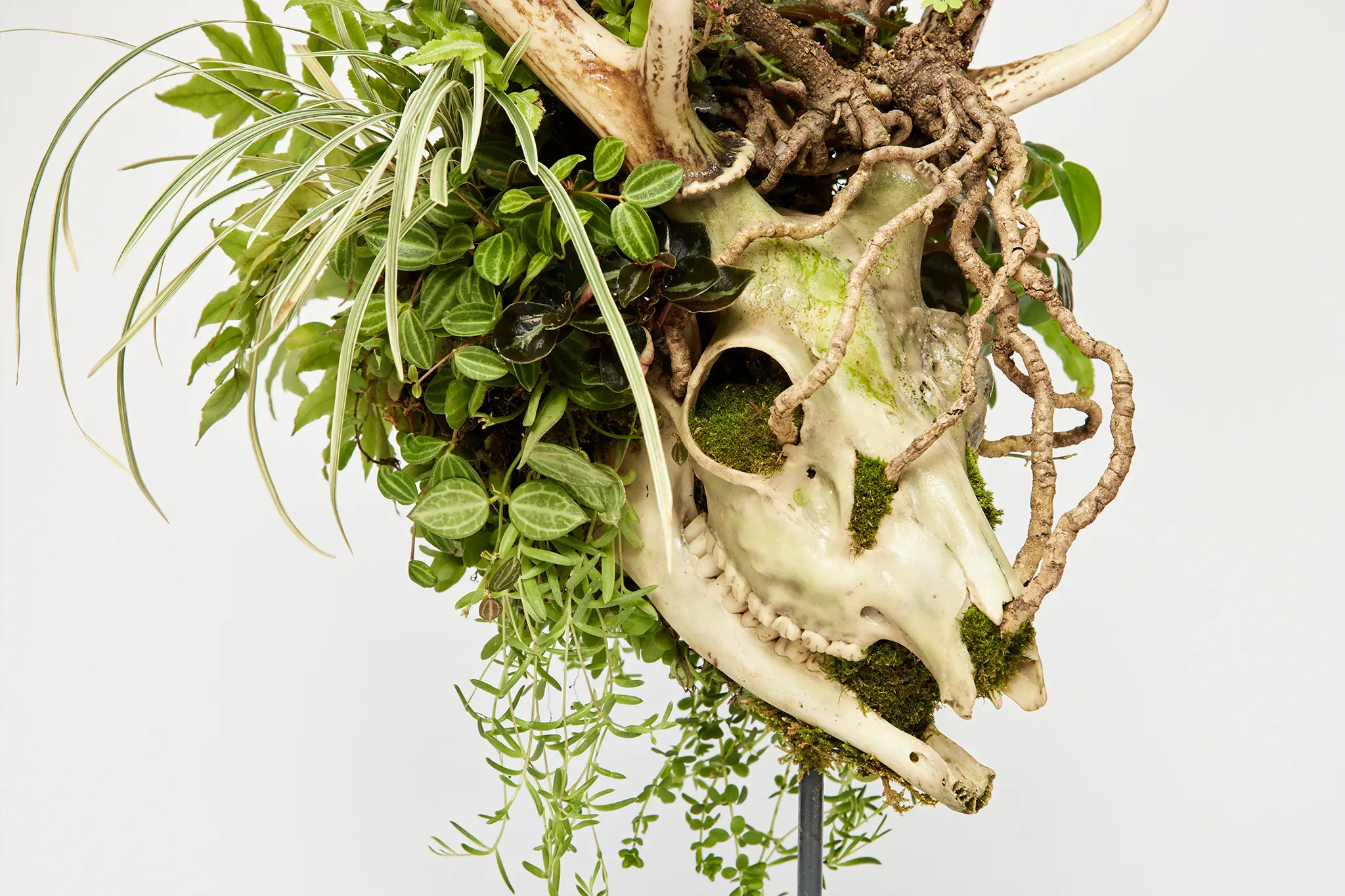 In one of Nakajima’s most popular projects, a deer jaw screams out from the bony roots of a bonsai. Other skulls sport phantom mossy tongues and antlers wrapped in vines. Dubbed “Skull Bonsai,” this project interlocks life and death in perfect juxtaposition, capturing the circle of life in one small plant pot. It’s an eerily beautiful image of the duality of nature: nurturing and consuming all life in perpetuity.