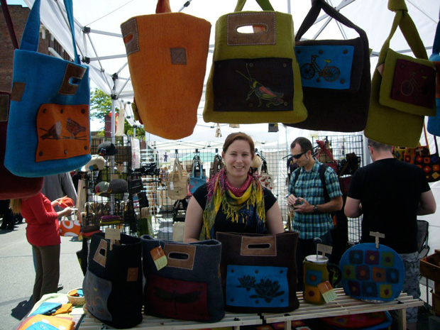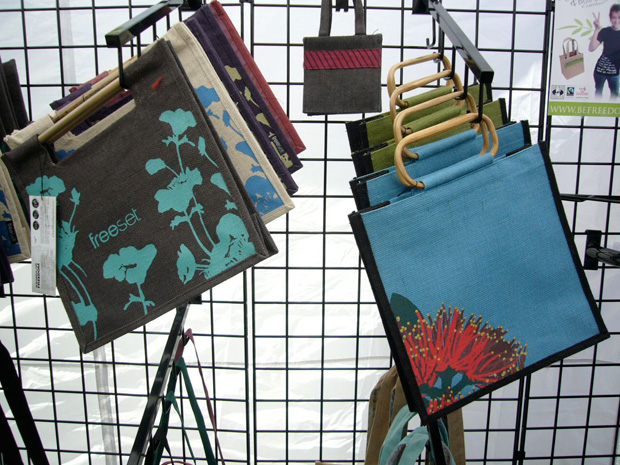 I found a beautiful collection of felted bags at the Government St. Market on Sunday from Fibres of Life handicrafts. The result of a creative partnership between a local community developer and the Association for Craft Producers (ACP) in Nepal, which supports low income artisans, this fair trade organization works with 90 percent women, providing targeted support for ethnic minority communities which can face additional economic and social challenges within the country. The Victoria importer, Freedom Enterprises, also represented design-conscious fair trade jute totes from India by Freeset.