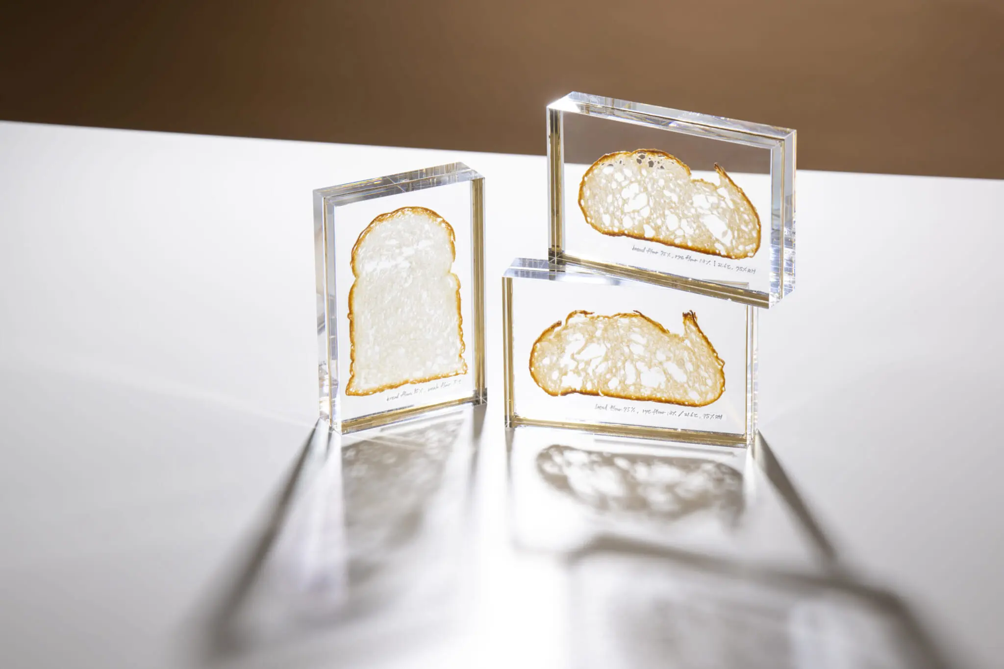 In addition to Pampshade’s signature bread lamps, Morita makes the Sliced series, which consists of decorative acrylic blocks, each containing a thin slice of bread. Especially in well-lit spaces, the cross-section reveals bubbles of various shapes and sizes. “From these bubbles, we can discover the bread’s path from flour to a small white mass, and then the yeast’s power to expand the bread little by little, until it is baked,” she explains, adding that the bubbles also create a lace-like effect.