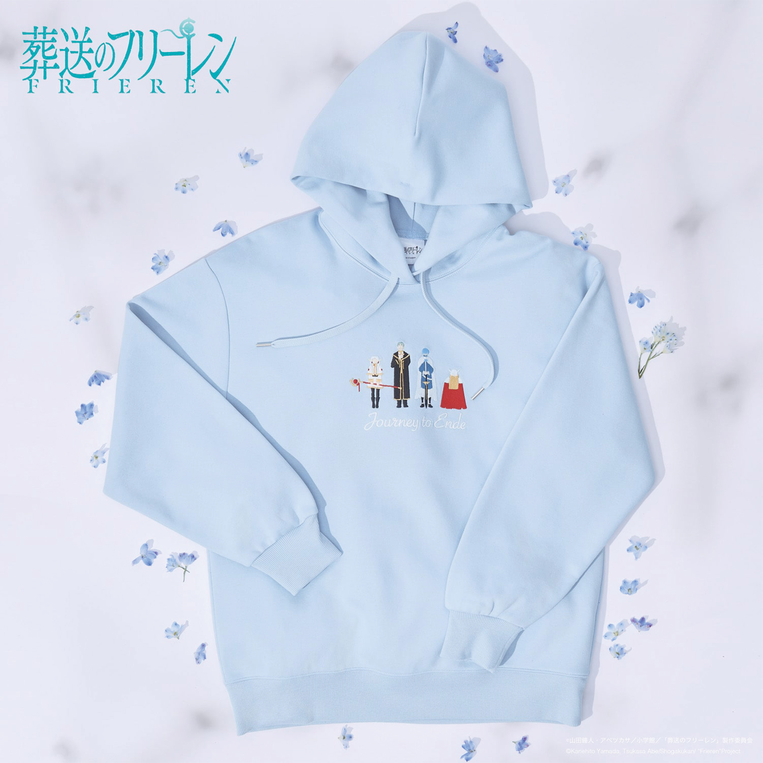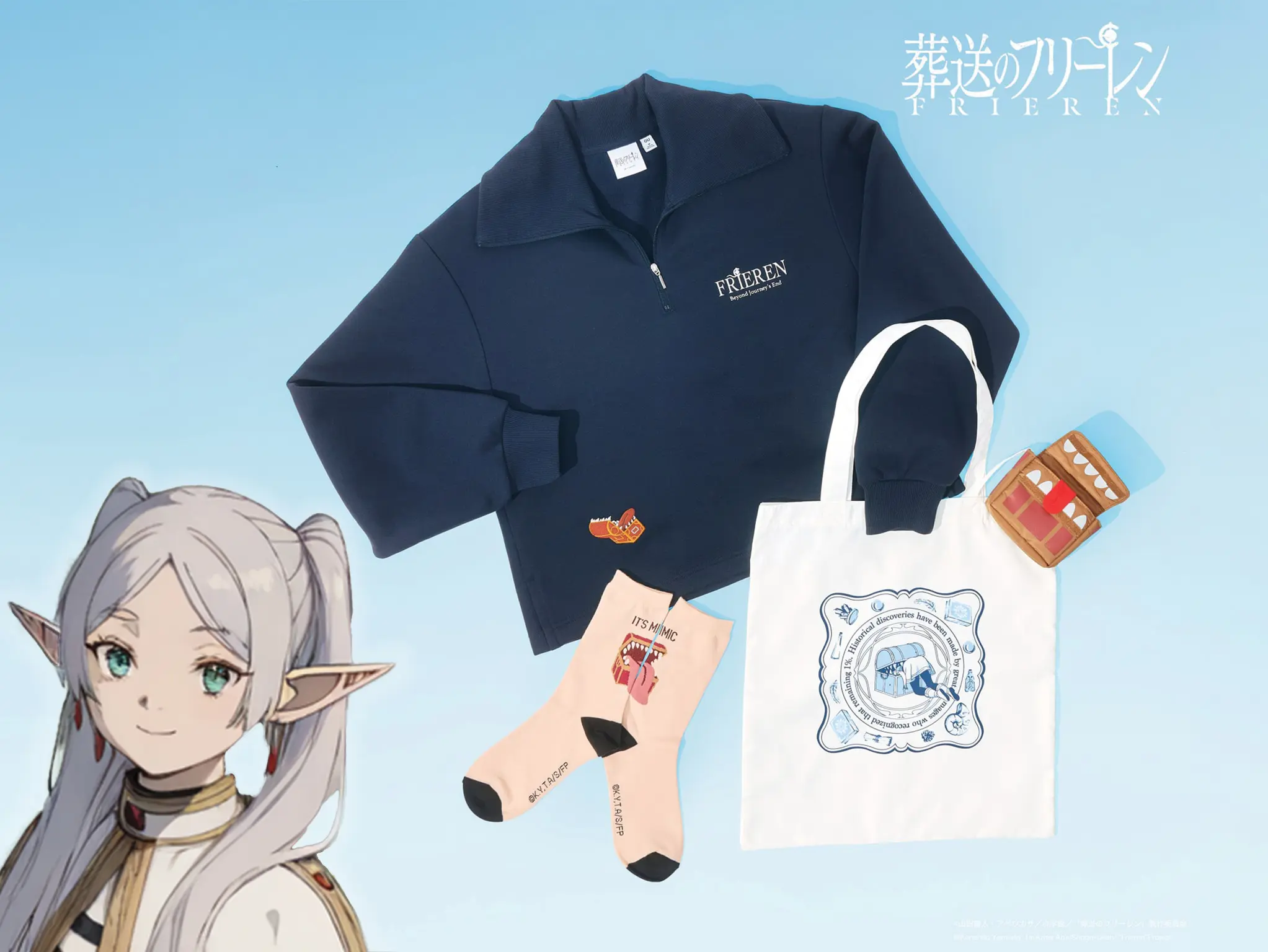 The collection consists of a variety of apparel and accessories, all designed with the anime in mind. One of the headline pieces is a baby blue pullover hoodie which features illustrations of the original party of heroes – Frieren, Himmel, Heiter and Eisen. This is contrasted with the grey sweater which instead features the new party of Frieren, Stark and Fern. There are also sweaters in other colors like beige and dark blue, which give off a slight college varsity vibe and also come with matching mimic socks and tote bag.