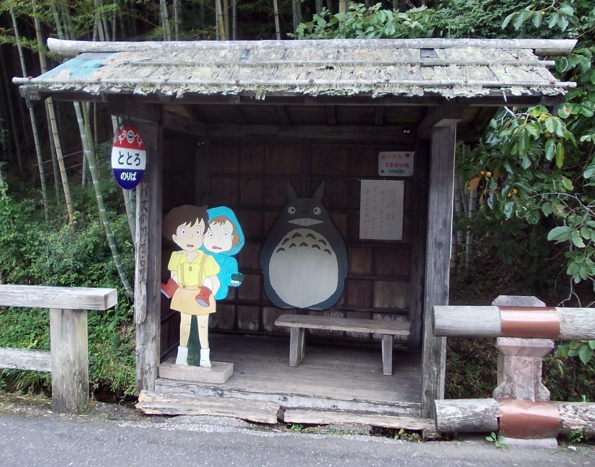 In Saiki city of Oita prefecture, there’s actually a district called Totoro (轟), and a bus stop with the same name. The small community bus stop is decorated with illustrations of Totoro, Mei and Satsuki, and has since become a popular tourist destination. Near the bus stop is a park called Totoro’s Forest, which has a large cutout of the Cat Bus, and dozens of tiny rock Totoro figurines have been left behind by community members.