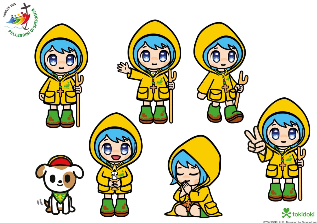 Luce’s name means “light” in Italian, matching with the jubilee’s “Pilgrims of Hope” theme. Luce has blue hair with shell-shaped glimmer in her eyes that are meant to be representative of the scallop shell of the Camino de Santiago, an emblem of the Catholic pilgrimage journey. The character also dons a yellow raincoat with the jubilee logo, mud-stained boots, a staff and a cross; symbolic of one’s journey through life’s storms.