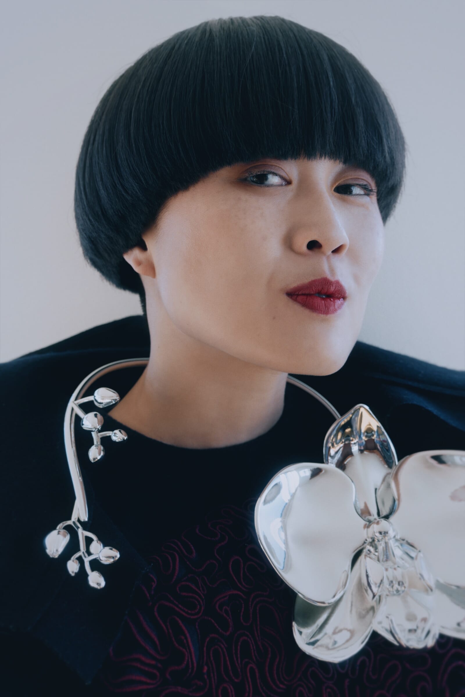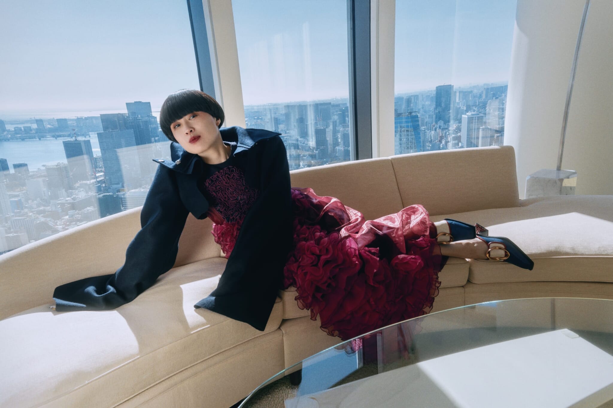 The comedian Atsuko Okatsuka is artfully sprawled across a sofa in the largest suite at the Andaz Tokyo Toranomon Hills, clad in a cascade of deep plum-colored tulle, an ornate silver neck piece and an architectural jacket. Light streams in from the floor-to-ceiling windows, illuminating her freckled skin as a photographer rapidly clicks away. The whole room is rapt, watching her ease with the camera, until Okatsuka suddenly raises her arms, swathed in voluminous black sleeves that cover her hands, and takes stock of her own pose. “It’s giving dead seal washed up on shore,” she gleefully proclaims.