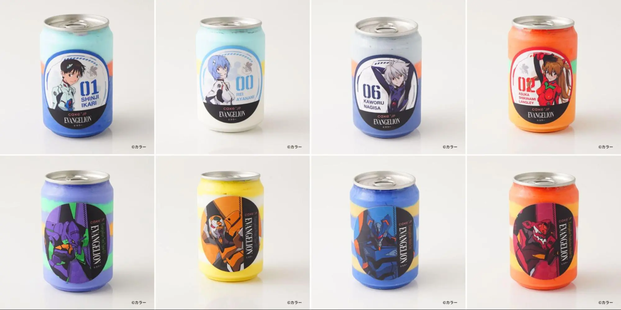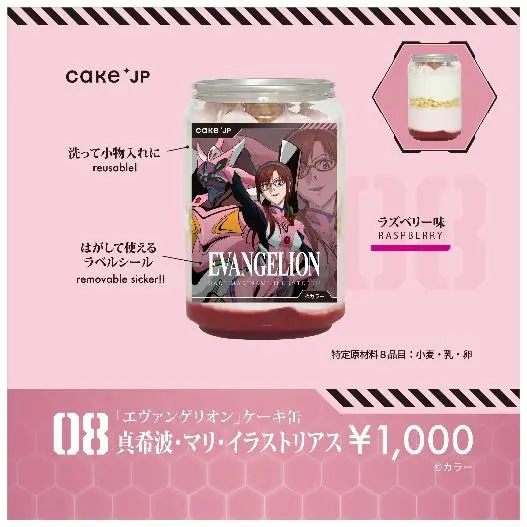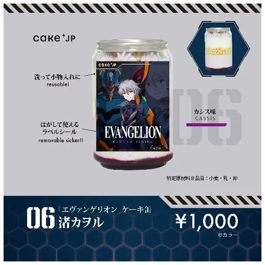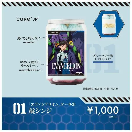 The Evangelion cakes in a can come in different colors and flavors to match the main characters. There are originally designed stickers on them and people purchasing them online also get a metal spoon with a charm designed like the character on your cake. The sticker is removable, and the can is reusable.