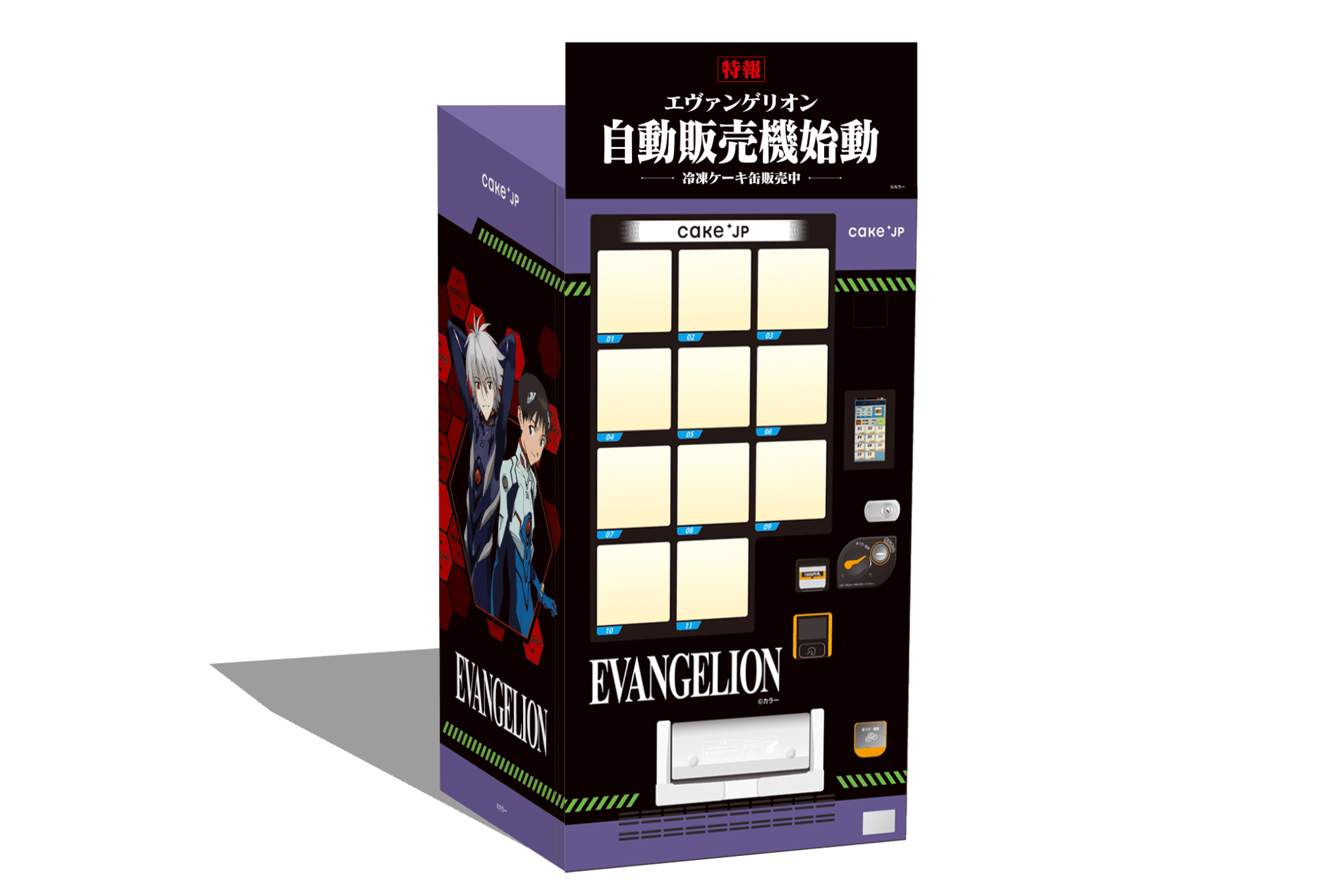 Cake.jp is bringing its Evangelion desserts closer to fans with its own cake-selling robots — vending machines. In July 2023, the first dedicated Evangelion cake vending machine was placed at Terminal 2 of Tokyo International Airport (Haneda). The placement is thought out and aimed at overseas visitors, to give them a sweet surprise as soon as they arrive in Tokyo. The vending machine itself is designed to be a good photo spot too. This machine stocks the three main Evangelion characters, plus Kaworu Nagisa, a side character from Evangelion 2.