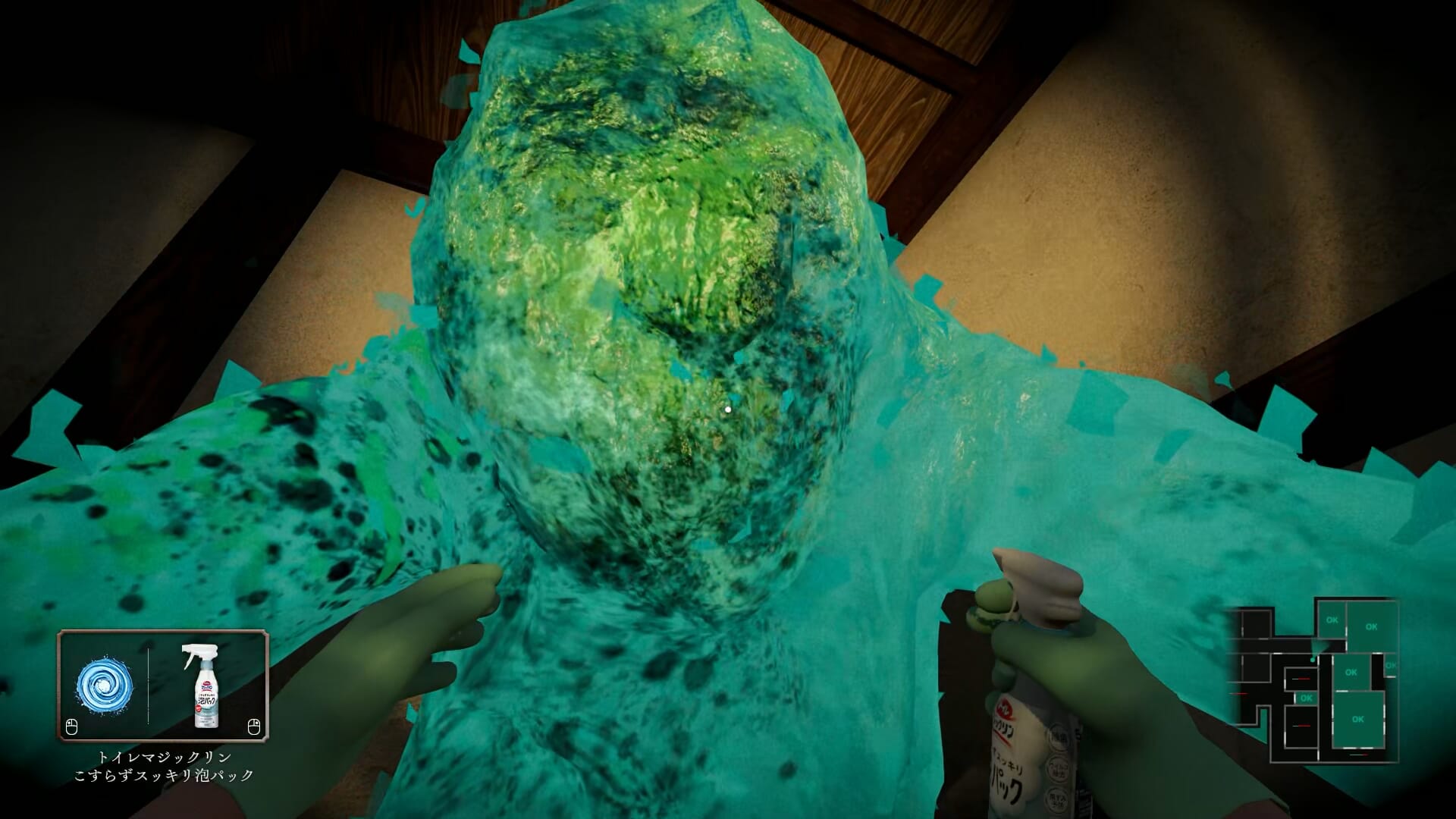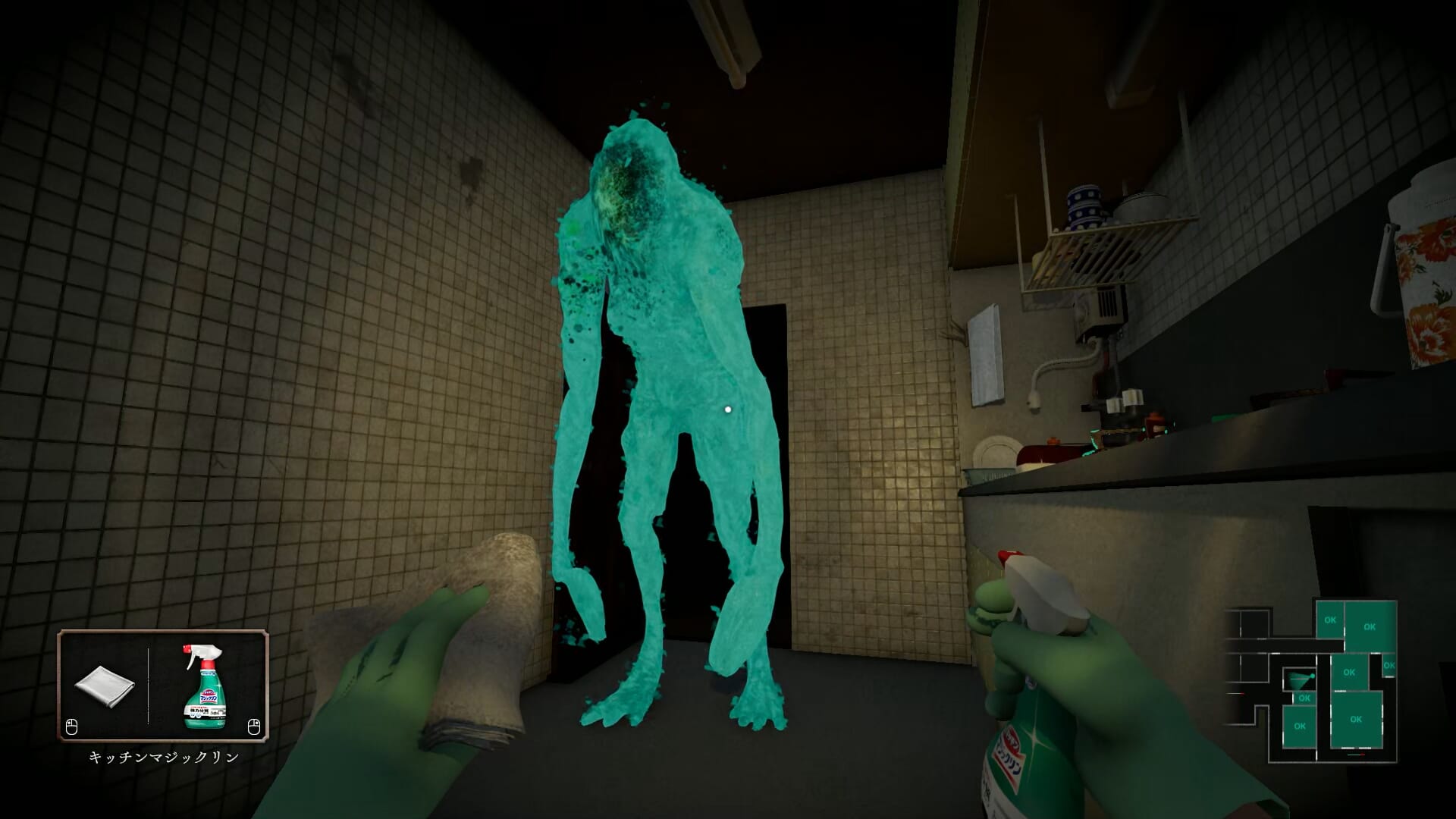 Driving up the tension, some of the cleaning products need to be left to soak before they can be washed away, which in normal day-to-day life, wouldn’t be an issue (in fact, I’d welcome it). But in Silent Cleaning, waiting for your chemicals to do their thing in the toilet while a massive mold monster stomps up and down the hallway outside is probably one of the more unique stresses that humanity has created for themselves. It’s not exactly terrifying, but there’s no denying that it’s clever.