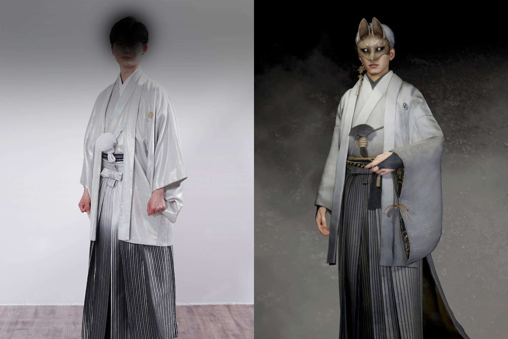 Matching his betrothed, Fox Mask wears a montsuki, an item of clothing adorned with kamon (family crests) and reserved for special occasions such as weddings. His montsuki has five kamon — on the chest, center back and sleeves — which evokes high formality. The kamon is also seen throughout the Dark Shrine and in the second transformation ritual, when Hinako is physically branded with the family crest to signal her position as a subservient possession. The montsuki ensemble includes a kimono, haori and striped hakama pants. Fox Mask’s haori is a bit stylized, extending into a train.