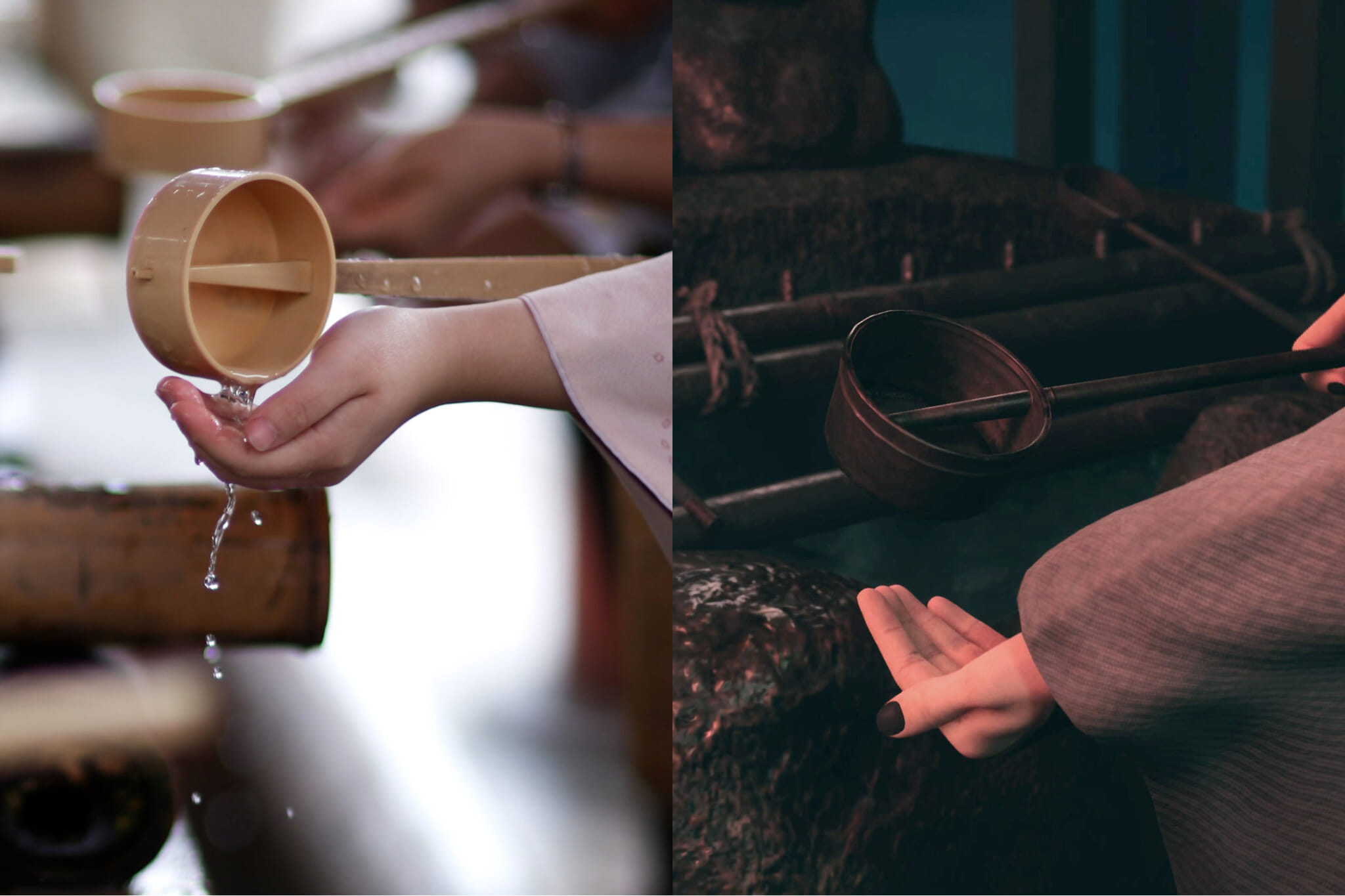 Purity is one of the central principles of the Shinto faith and can be achieved by partaking in purification practices such as temizu. With temizu, one purifies oneself before entering the shrine’s main sanctuary, using a dipper to pour water onto the left hand, followed by the right hand. Then, water is used to rinse the mouth before being carefully spit out. Finally, the dipper is tilted vertically so that any remaining water trickles down the handle to purify it for the next user. This ritual is recreated step-by-step in the game by Fox Mask, as Hinako hallucinates that the water is bubbling lava.