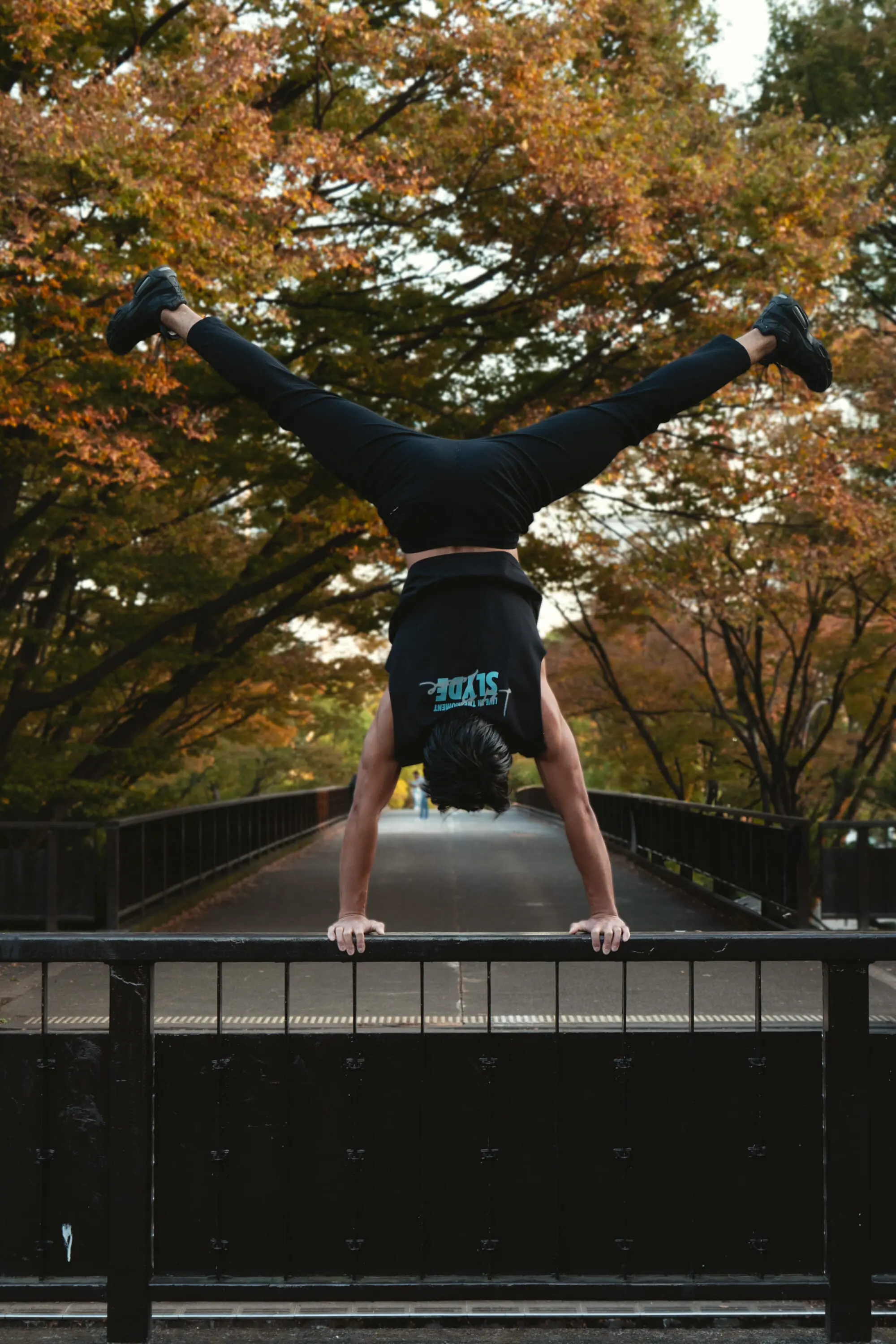 Within minutes of meeting Naoki “Nao” Yamakasi (formal family name, Ishiyama), he is upside down, doing a handstand on the rails of the bridge in Yoyogi Park. A 6-meter drop beckons on one side. For anyone watching nearby, the sight is likely mind-blowing, but for Nao, this is a regular Tuesday. That’s because he’s a practitioner of l’art du déplacement (“the art of movement”) — more commonly known as parkour.