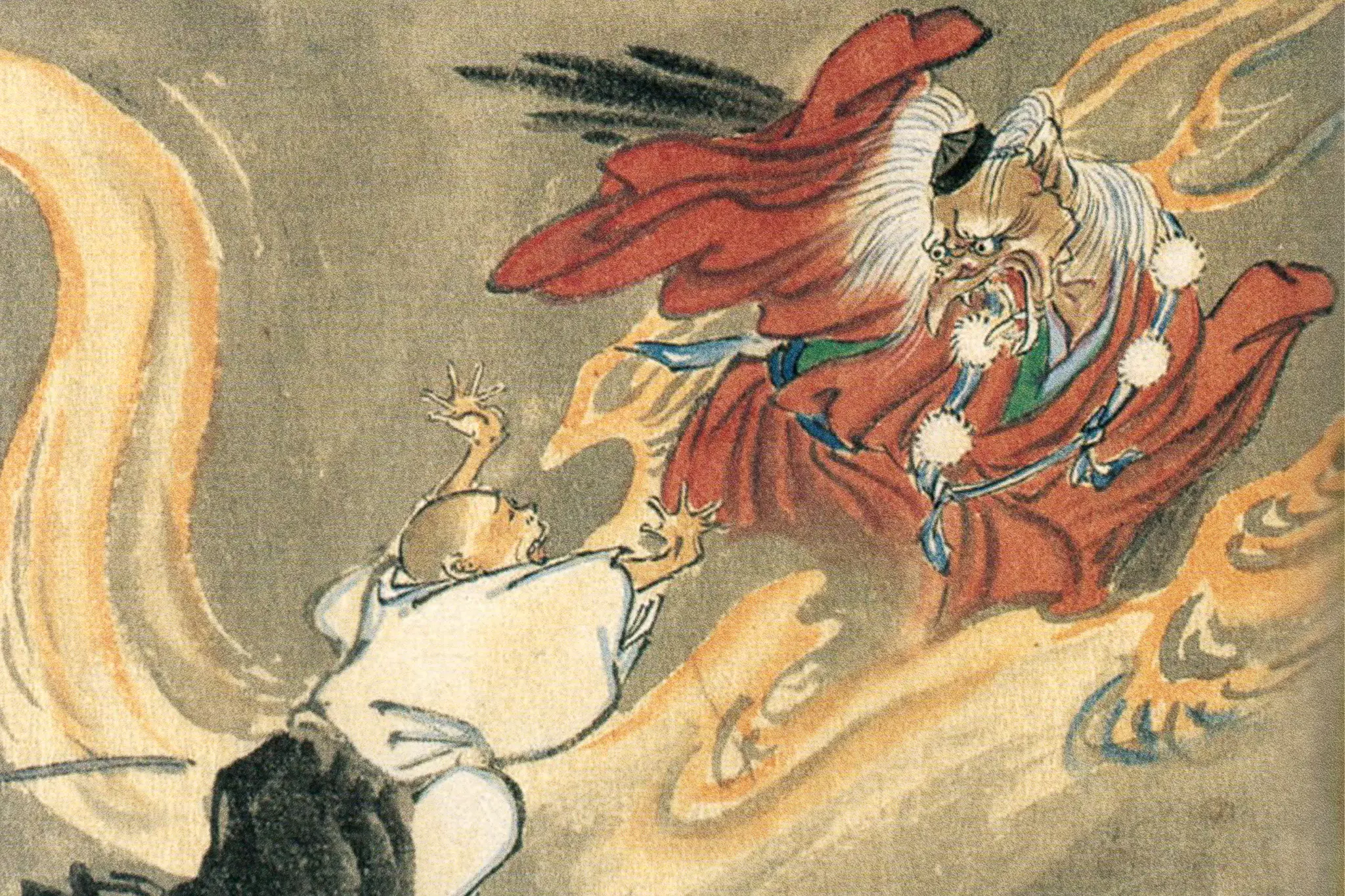 Tengu are actually imports from Chinese mythology, where they are malevolent dog-like beings. When they arrived in Japan, though, they were first associated with foxes and then birds such as black kites, which even today are known for things like snatching food from people’s hands. That might be how the Japanese Tengu got a reputation for being mischievous, including their affinity for tricking monks into eating feces? OK. That explains the bird-like, happy-go-lucky Urogi, but what about Sekido? How did tengu go from winged frat bros to men of the cloth?
