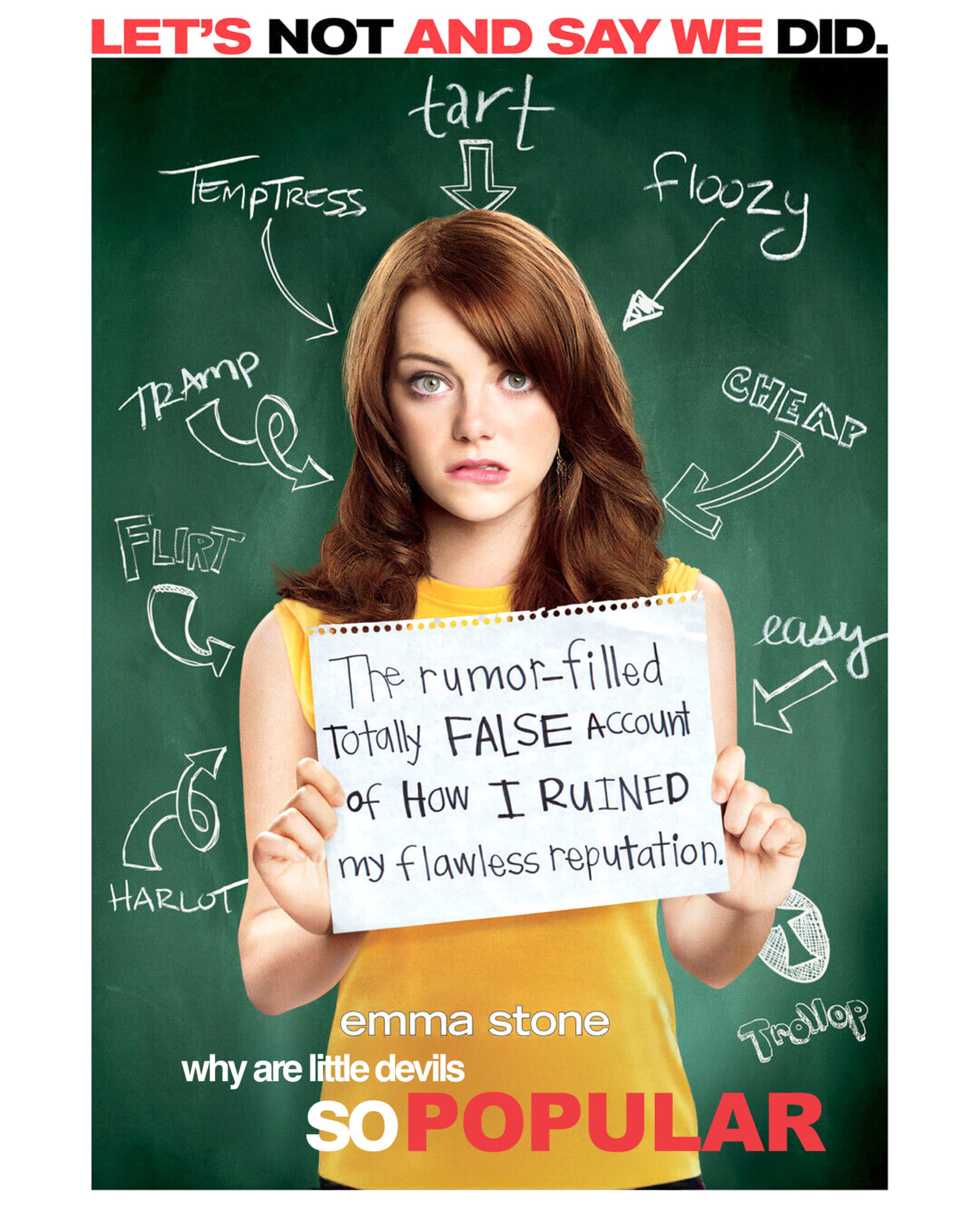 Easy A is a 2010 teen comedy that follows Emma Stone as high school student Olive Penderghast. When a rumor spreads that she has slept with a college boy, Olive starts to be labeled as the school tramp. She tries to turn this in her favor, using her new reputation of promiscuity to help boys increase their popularity by letting them claim they have had sex with her in exchange for gift cards.
