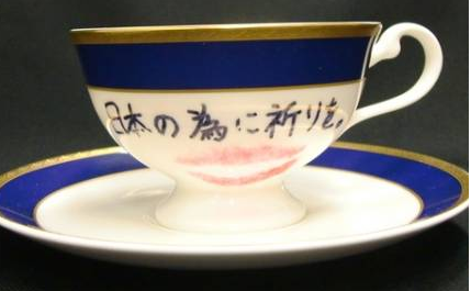 The US Embassy reported to Kyodo news in Tokyo that a teacup (pictured, right) used at her press conference in Tokyo in June 2011 – Gaga is pictured above with ambassador John Roos – will be sold to the highest bidder through the Yahoo! Auctions site.