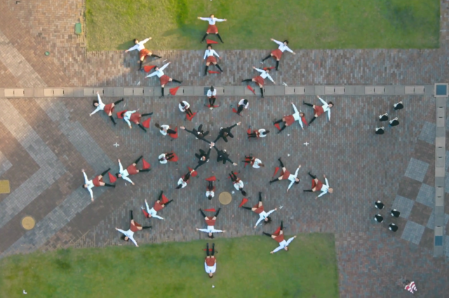 For the mandala-like scene from above that shifts into pixel style writing as the camera moves further and further up into the sky, a manual and GPS-controlled drone was taken 800 meters in the air to film more than 1,500 volunteers for their impressive synchronized umbrella scene.