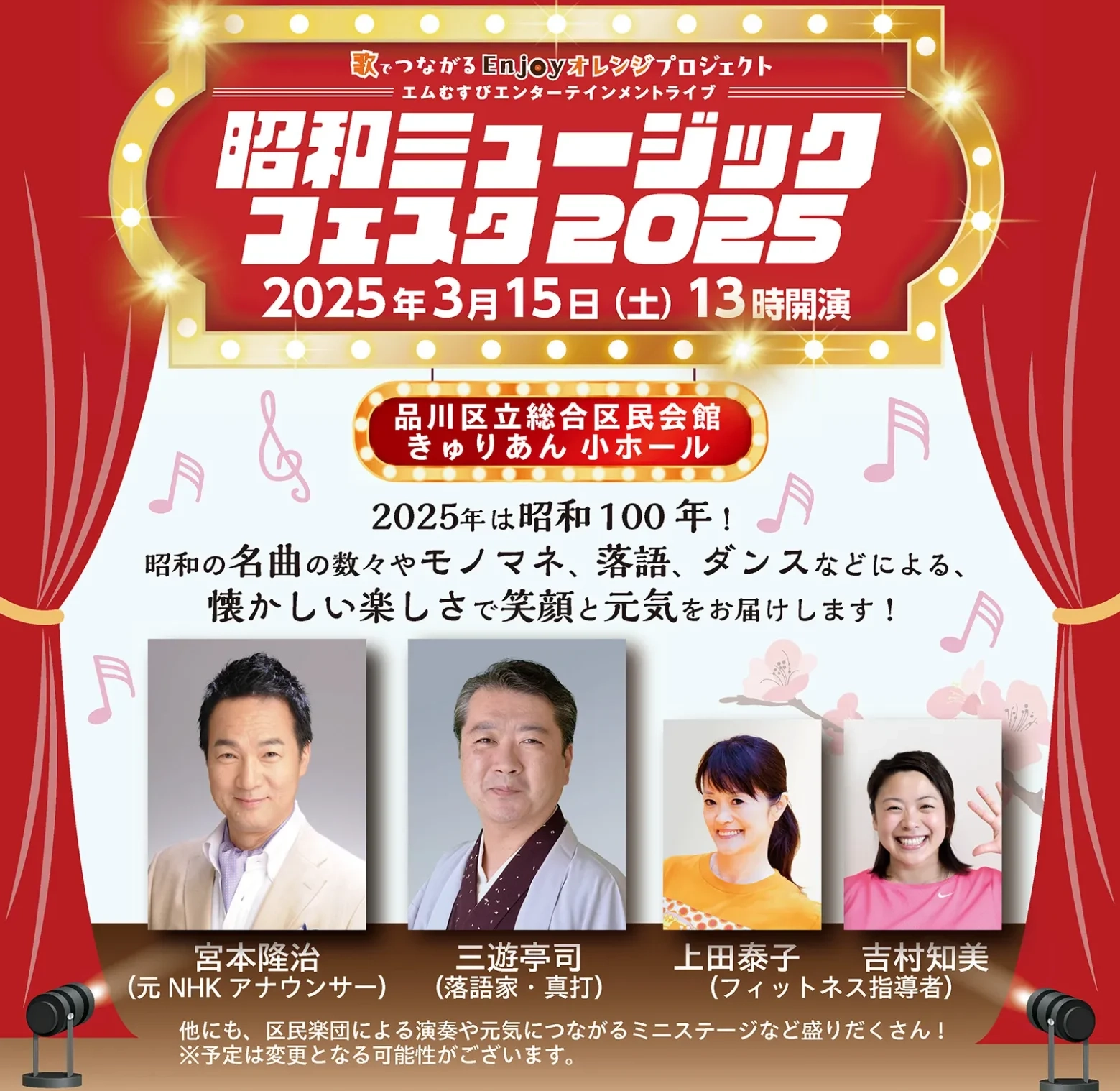 Get ready to step back in time and celebrate the vibrant spirit of the Showa era at the Showa Music Festa 2025. Special guest Ryuji Miyamoto, a former NHK announcer, will share tips for maintaining vocal health and perform beloved Showa classics. There will also be a rakugo session by Sanyutei Tsukasa and a slow aerobics segment designed for all fitness levels.