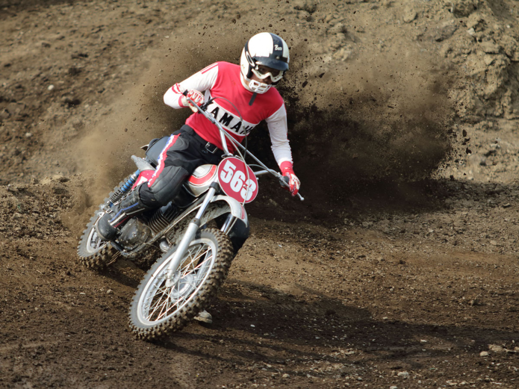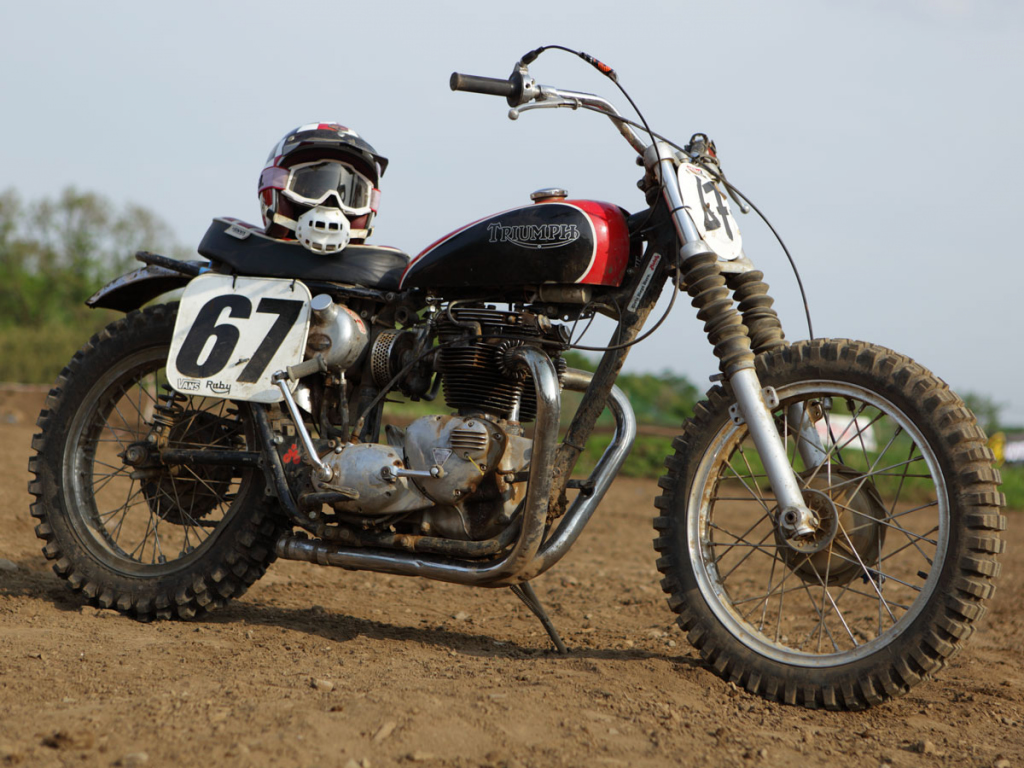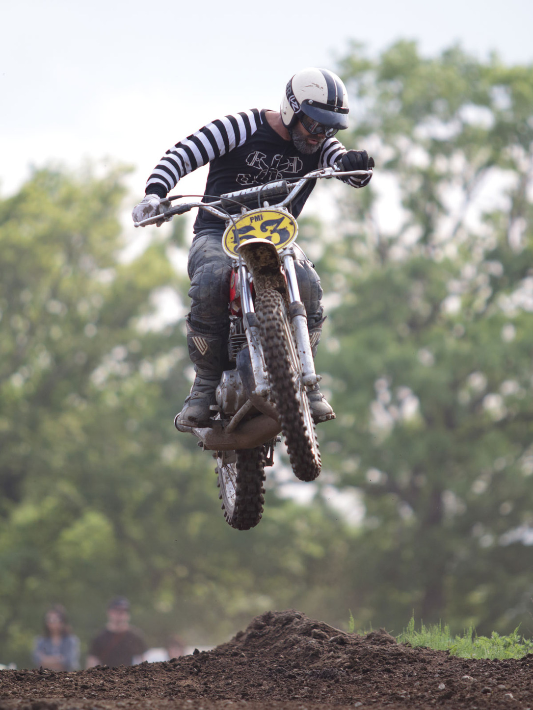 Hard-tailed Triumphs ran against slightly more modern twin suspensions, two-strokes against four-strokes. The riders rode that thin line between control and utter mayhem: sometimes they would make heavy contact in tight berms, and sometimes a misjudged landing would launch a rider off the track. The riders stood in hearty defiance of danger, and embraced the consequences.