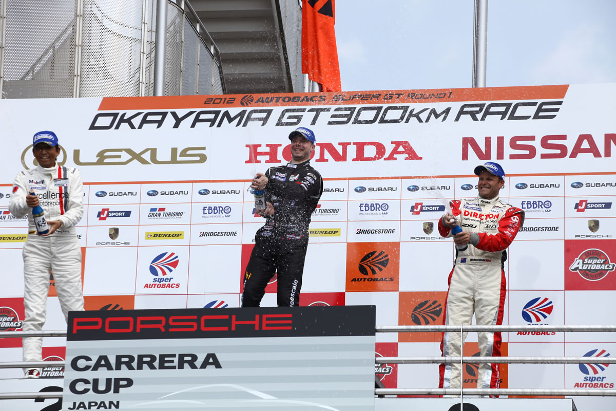 The #90 OGT! Racing Porsche 911 racecar (pictured, above), leading the championship, secured a win in round one of the series at Okayama and is hoping for more champagne moments, like the one pictured here, that will take it towards the end of season trophy.