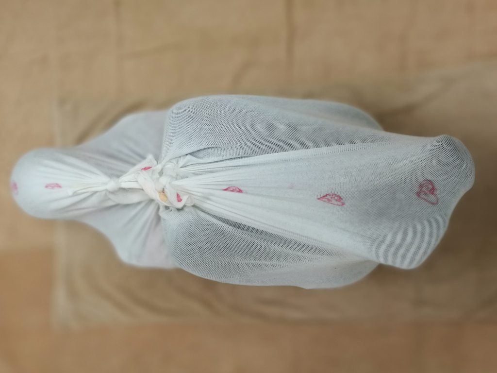 People find the image of a body tied up in the cotton mesh fabric disturbing or uncomfortable to look at – which has ironically (or predictably?) made the topic a hit on the Net. “But in fact it’s based on the very soothing practice of ohinamaki – wrapping newborn babies up to mimic the feeling of being in the womb, and help them sleep better,” she says.