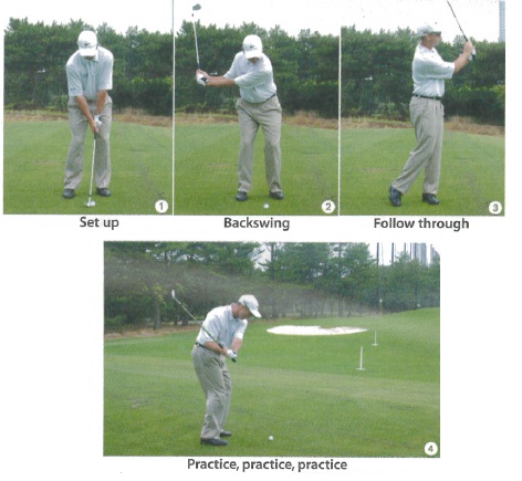 The pitching swing is predominantly an arm swing. The feet are set relatively close together with the ball positioned in the middle of the stance. During the takeaway, the upper body rotation works the club away from the ball with the wrists hinging to move the club up in front of the body. There is very little weight transfer with this action.