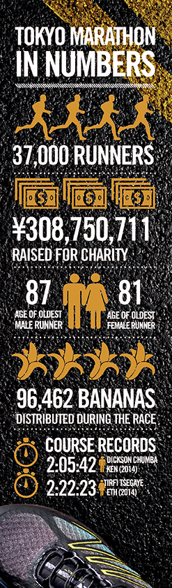 Another group to pay attention to are some of the speedier competitors on the road: the wheelchair marathoners. The Tokyo Marathon course is generally flat, so it is an ideal place to break records—if the weather permits. This year marks the first time that international elites have been invited to compete in the Tokyo Wheelchair Marathon. Domestic athletes like Hiroyuki Yamamoto and Kota Hokinoue will have a berth in the 2016 Paralympics at stake and are going up against a field that includes international stars such as World Champion Joshua George (USA) and Ernst van Dyk (South Africa), a multiple Paralympic wheelchair event medalist and 10-time winner of the Boston Wheelchair Marathon. Meanwhile, on the women’s side, eight-time Tokyo Marathon winner Wakako Tsuchida will be up against Tatyana McFadden from the US, who won in Chicago, Boston, New York, and London last year.