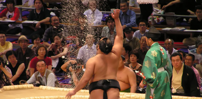 Welcome to the enchanting world of sumo, the national sport of Japan which sees massive, nigh-naked gladiators exhibit phenomenal feats of strength. At the same time, these mountainous men must pay homage to Shinto beliefs, purifying the combat surface with salt while clapping hands and stamping giant feet to ward off evil spirits. Not only is every sumo match steeped in Shinto ritual, but also bound by the ancient code of the samurai warrior, which requires combatants to open their arms wide and drop their palms to prove they carry no hidden weapons prior to battle. Throw in samurai hairstyles and war-fan wielding referees elegantly clad in shiny silk garb, and you understand exactly why sumo has the power to intrigue even the most casual onlooker.