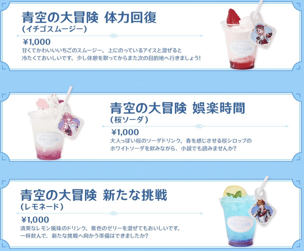A café on-site will also be offering a menu inspired by the game. Fans of Charlotte and strawberries can have both in one drink with the sweet and cute strawberry smoothie, a perfect representation of the Cryo catalyst user. There’s also the sakura soda made with cherry blossom syrup, featuring Yae Miko, priestess of the Grand Narukami Shrine that sits among the cherry blossom trees. The most interesting looking of all is the blue lemonade drink with purple jelly. The two colors represent Childe’s visions and delusions. For those after a warm drink, you can also opt for a nice hot latte which comes with chibi latte art of Genshin Impact characters from Mondstadt, Liyue, Inazuma and Fontaine.