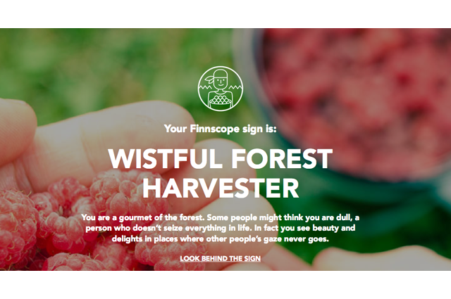 This year Visit Finland introduces a sequel to the successful generator, called Finnscope, as a part of their Spring 2015 campaign. Finnscope lets you discover your “Finnish horoscope and who you are.” The star signs are fictional but there is a grain of truth in all of them since they are based on Finnish nature, the year’s natural cycle and on the unique characters of this faraway nation.