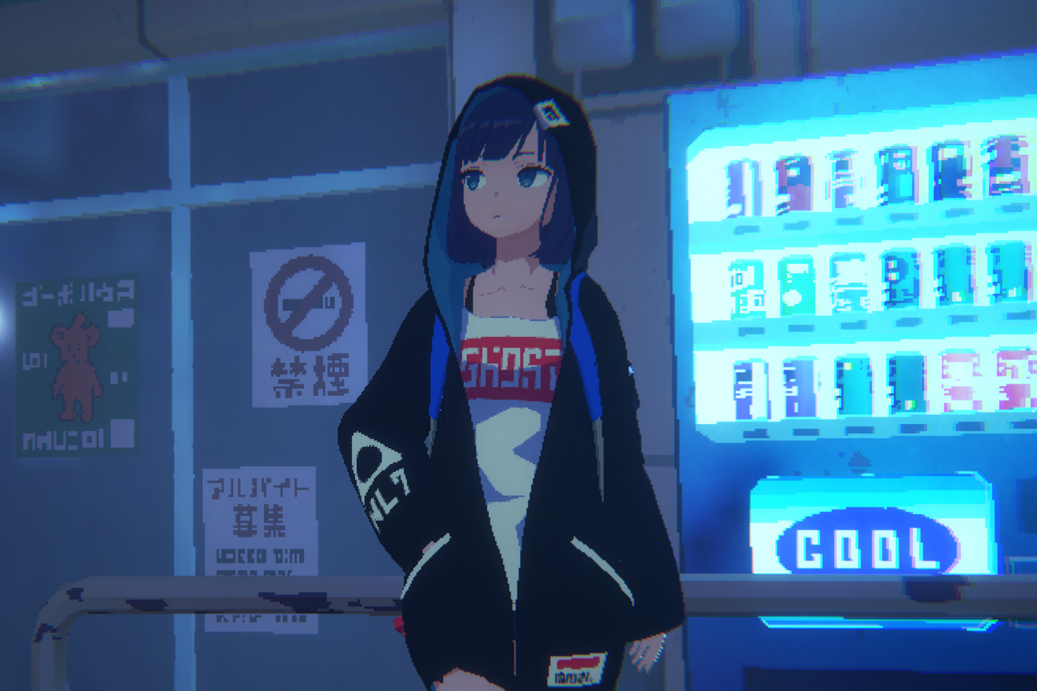 Released screenshots of the game so far depict a darker side to Tokyo, where the characters seem to operate mostly at night and occupy hidden alleyways or late-night train carriages. Despite this, the game feels bright through the usage of neon lights in that characteristic Blade Runner style that’s also popular with Tokyo night photography. This color palette is the work of Art Director Seiichi Terashima, who Ikeda has worked with for a long time and whose inspired tastes have created these dark night scenes with surprisingly minimal usage of black and daytime scenes painted in a green tint.