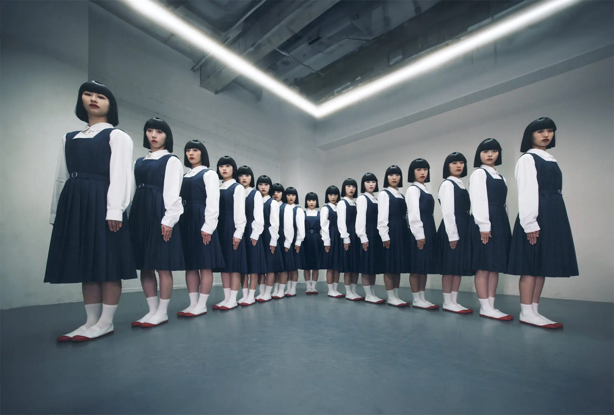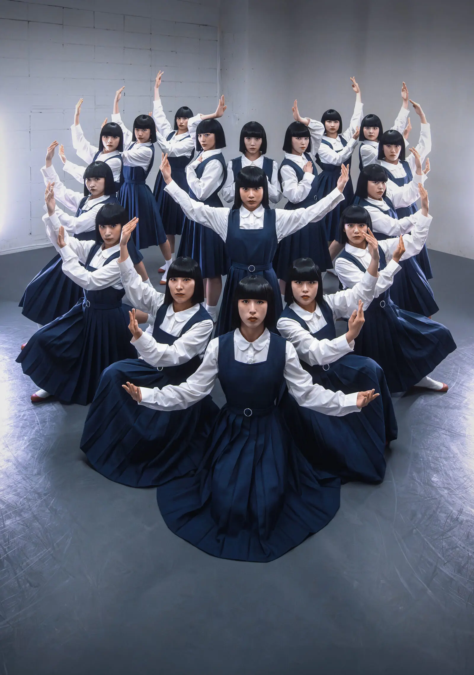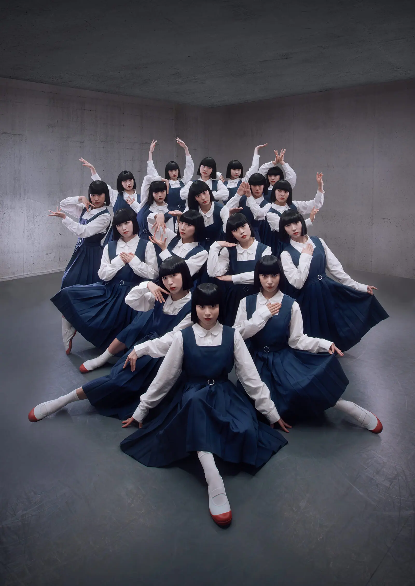 The door to a small, underground studio in Tokyo swings open, and in files a procession of 17 women in identical garb: sleek, bobbed hair; navy, pinafore-style dresses over blouses with billowing sleeves; gleaming white ankle socks. Responding to the presence of an audience — a small camera crew, a director and myself — they switch into performance mode, smiling widely, shaking their heads rapidly and shuffling their feet as they pass through the door in single file, giving the impression of freshly wound wind-up dolls. At their tail is a woman clad in all white, walking normally.