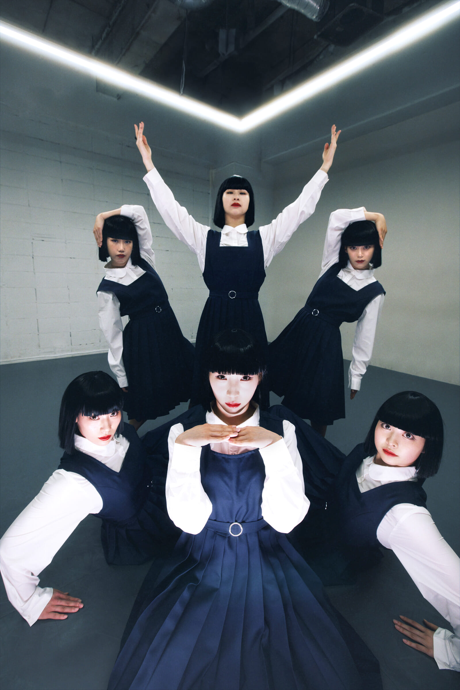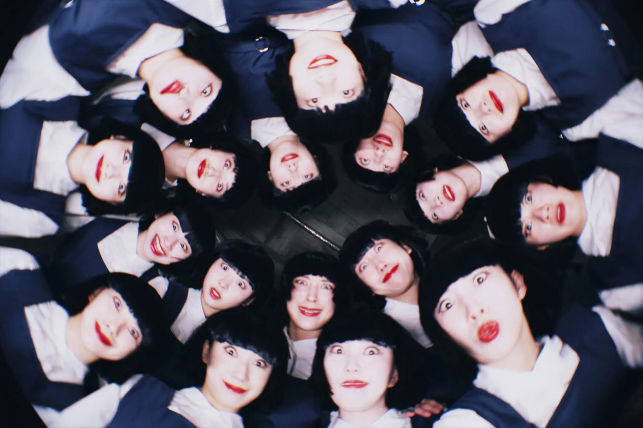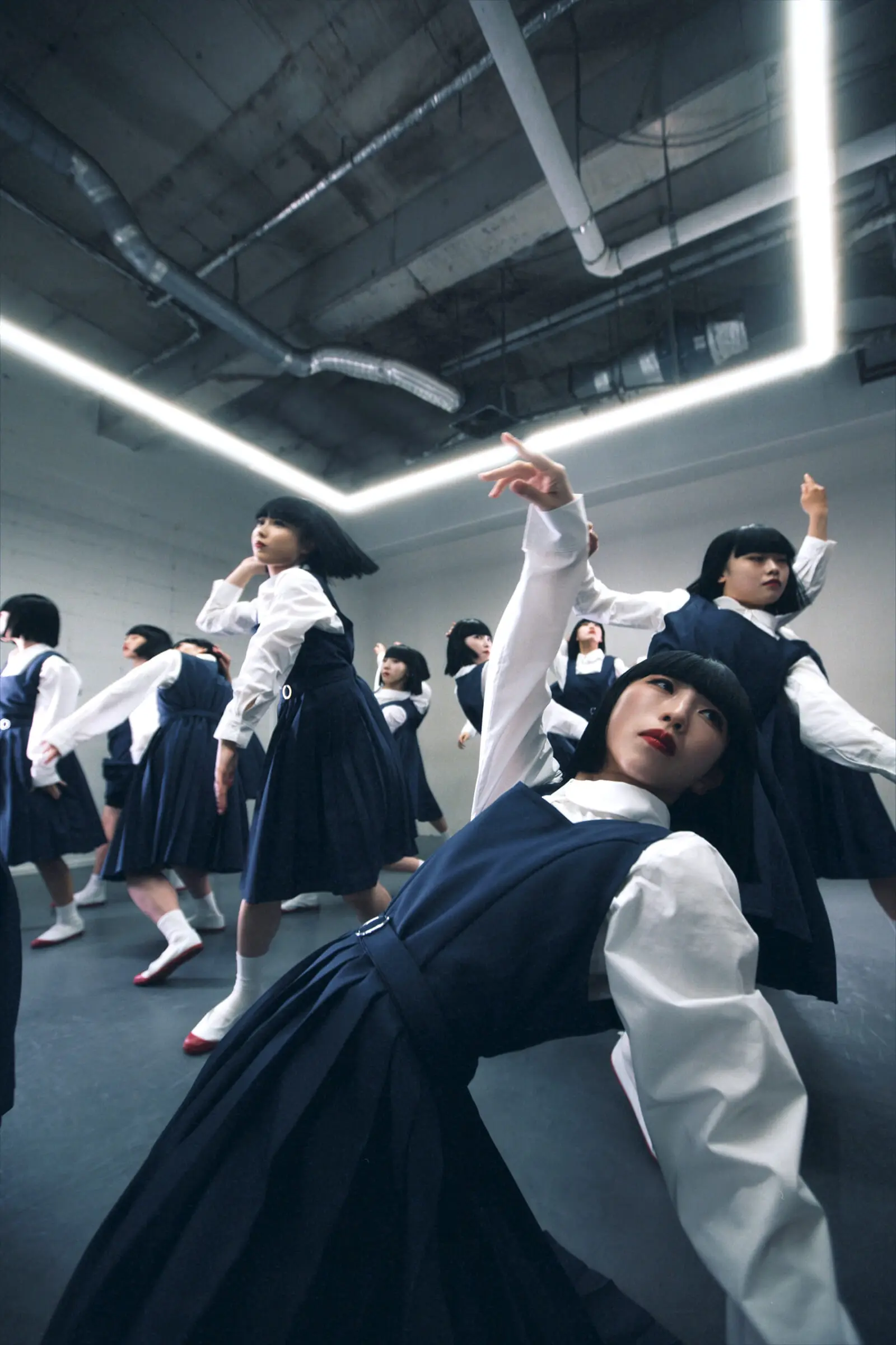 The door to a small, underground studio in Tokyo swings open, and in files a procession of 17 women in identical garb: sleek, bobbed hair; navy, pinafore-style dresses over blouses with billowing sleeves; gleaming white ankle socks. Responding to the presence of an audience — a small camera crew, a director and myself — they switch into performance mode, smiling widely, shaking their heads rapidly and shuffling their feet as they pass through the door in single file, giving the impression of freshly wound wind-up dolls. At their tail is a woman clad in all white, walking normally.