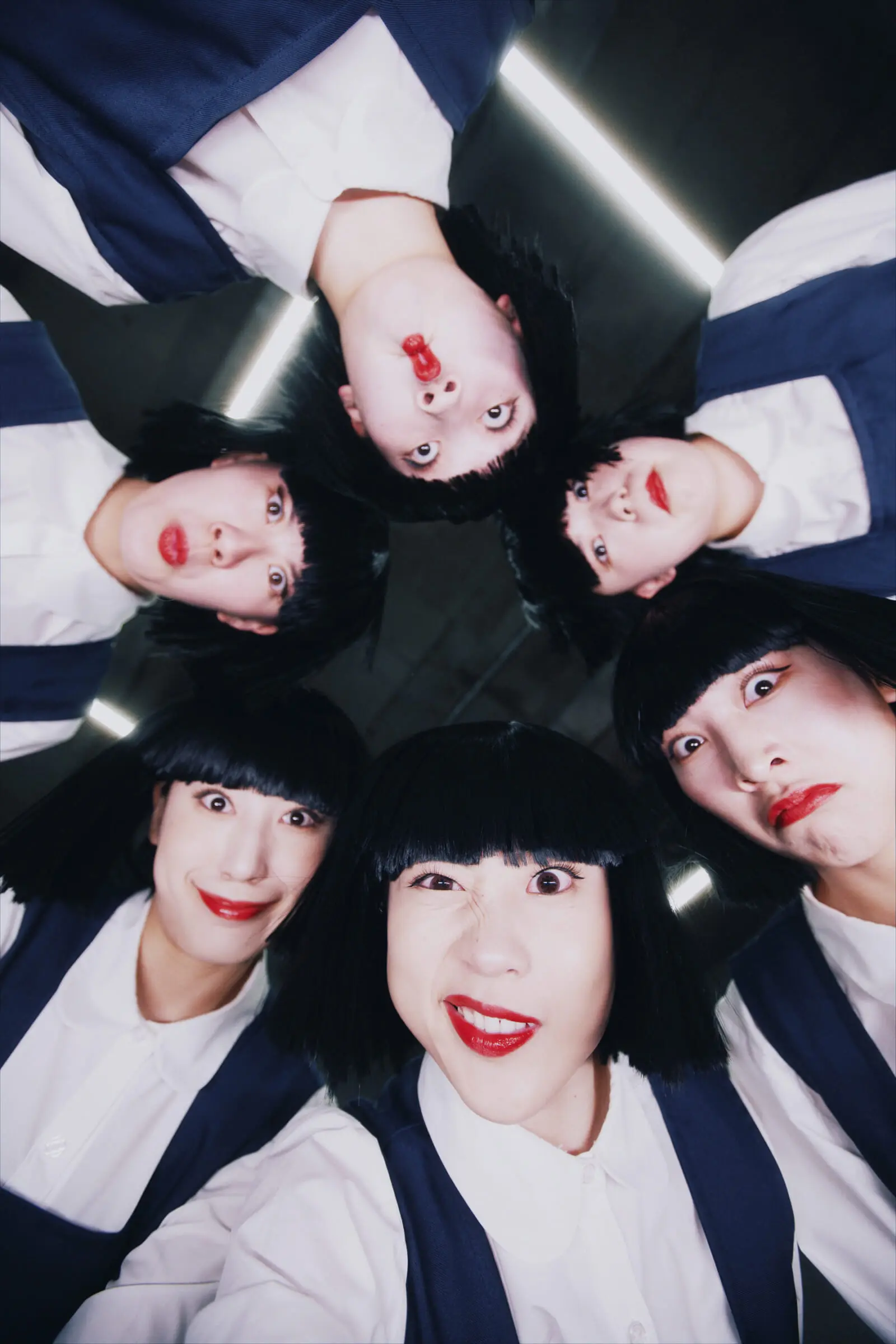 Throughout, the members cycle through an array of exaggerated facial expressions, the sorts of faces you’d pull if a camera-wielding friend proclaimed, “Let’s take a silly one!”: duck-lipped pouts, crossed eyes with nostrils flared, eyes narrowed and mouths contorted into jokey lipsticked grimaces. One of their signature looks involves a hyperbolically blank expression, with the eyes held almost uncannily wide open. “During filming, our contact lenses often fall out,” jokes Nona, who is particularly skilled at emoting and often takes a center position.