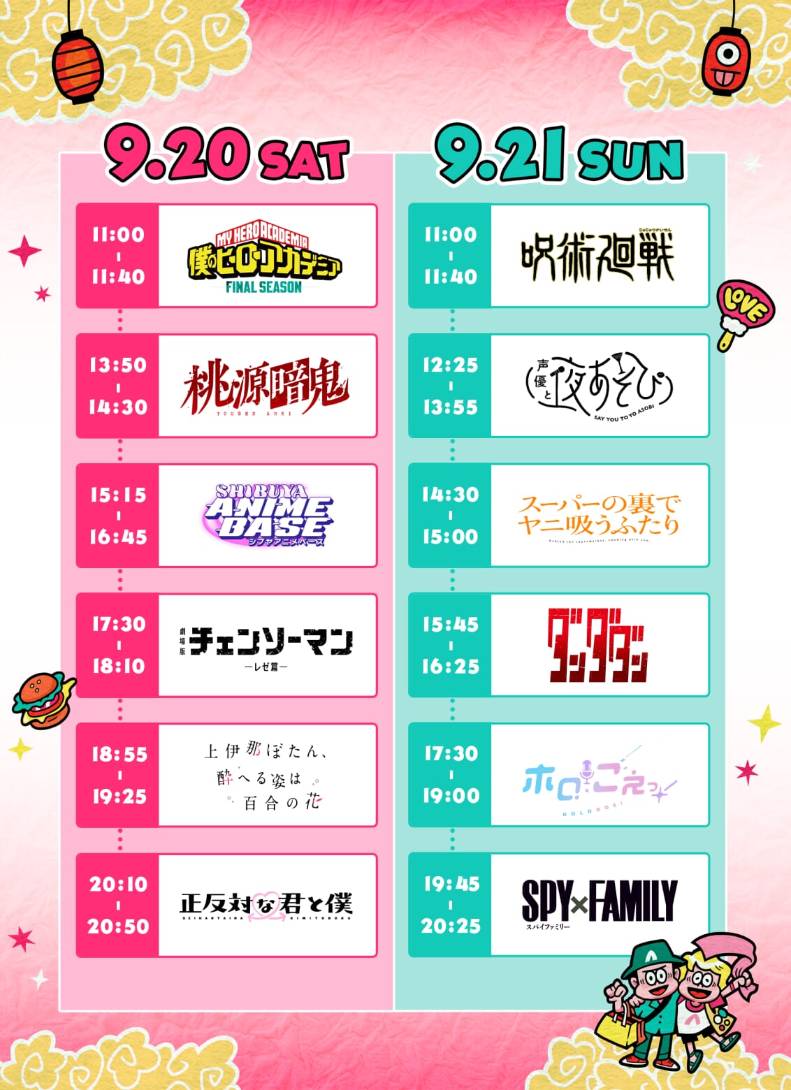 Miyashita Park’s rooftop lawn will have free performances with cast members from popular anime series. The rooftop stage invites performers such as Daiki Yamashita and Ayane Sakura from My Hero Academia, and Takuya Eguchi and Kenichiro Matsuda from Spy x Family. Numbered tickets are required to enter the stage area. Tickets must be applied for in advance.