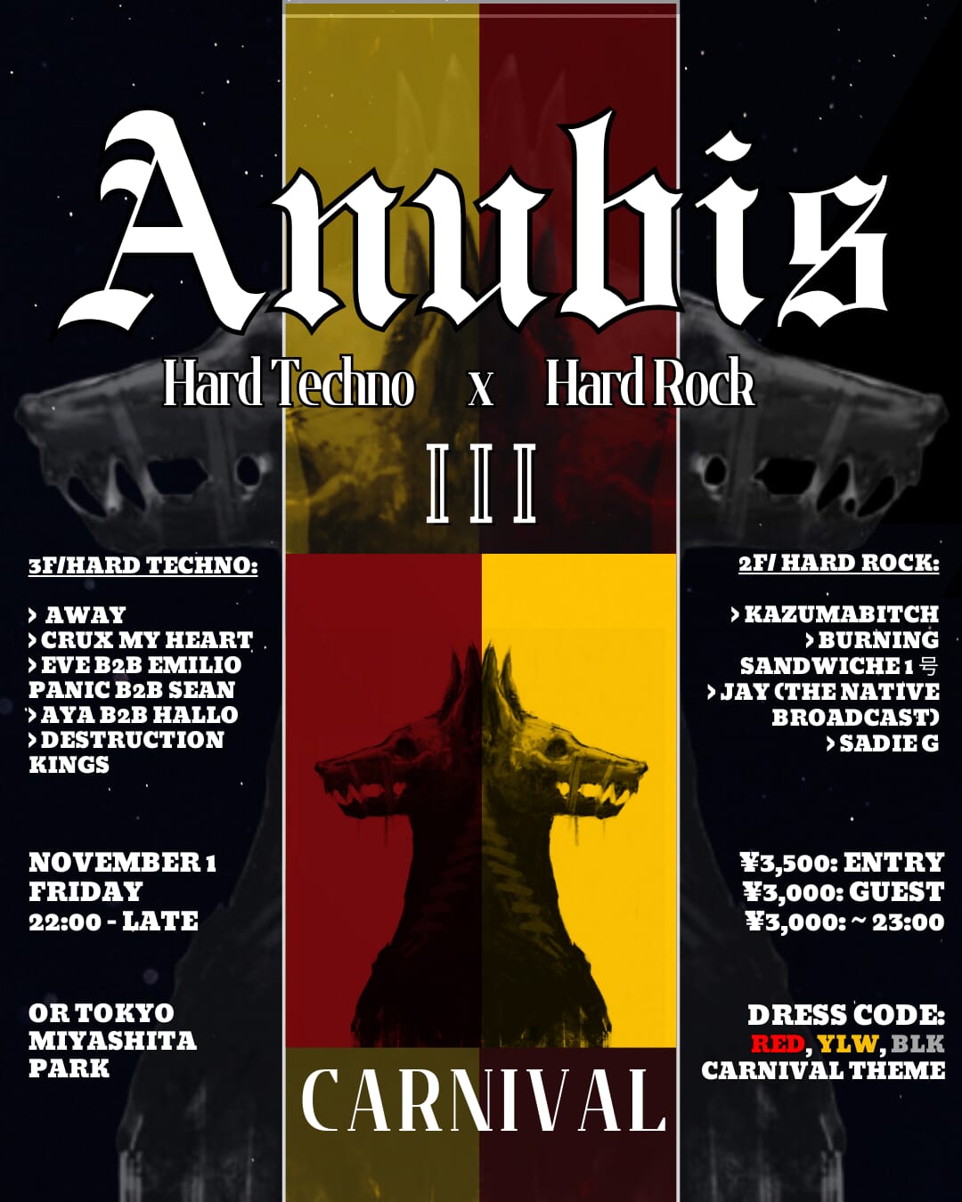 Get ready for a night of thrills and pounding beats at Anubis Vol. 3: Carnival on November 1 in Shibuya. This epic Halloween after-party features two floors of pure madness: hard and industrial techno on one floor and hard rock and metal on the other. With an incredible lineup of DJs, plus two special guest techno DJs, the energy will be through the roof.