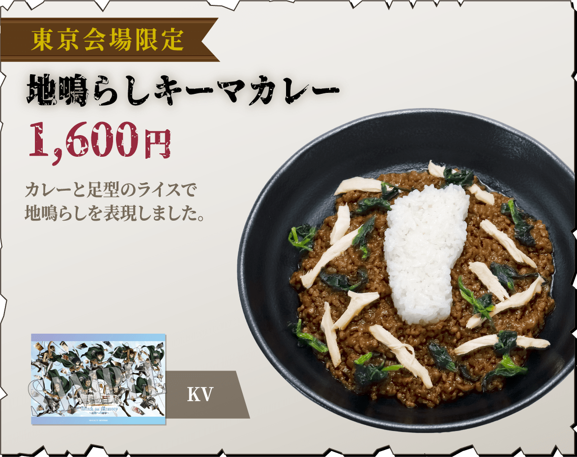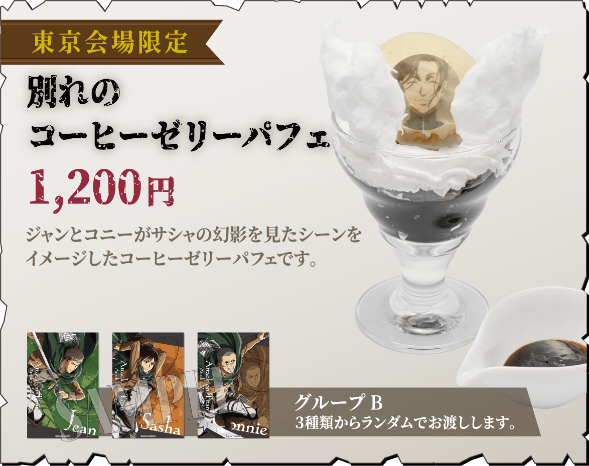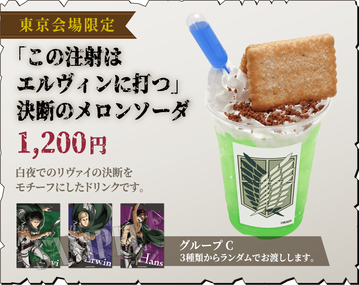 The Colossal Titan dessert plate is inspired by the first episode of the series and comes with a card featuring either Eren, Mikasa or Armin. The Tokyo venue will serve a roll cake and the Osaka venue will serve a baumkuchen. The other menu offerings will only be available at the Tokyo store. Try Sasha’s farewell coffee jelly parfait, Erwin’s decision melon soda and the earth-shaking Rumbling keema curry.