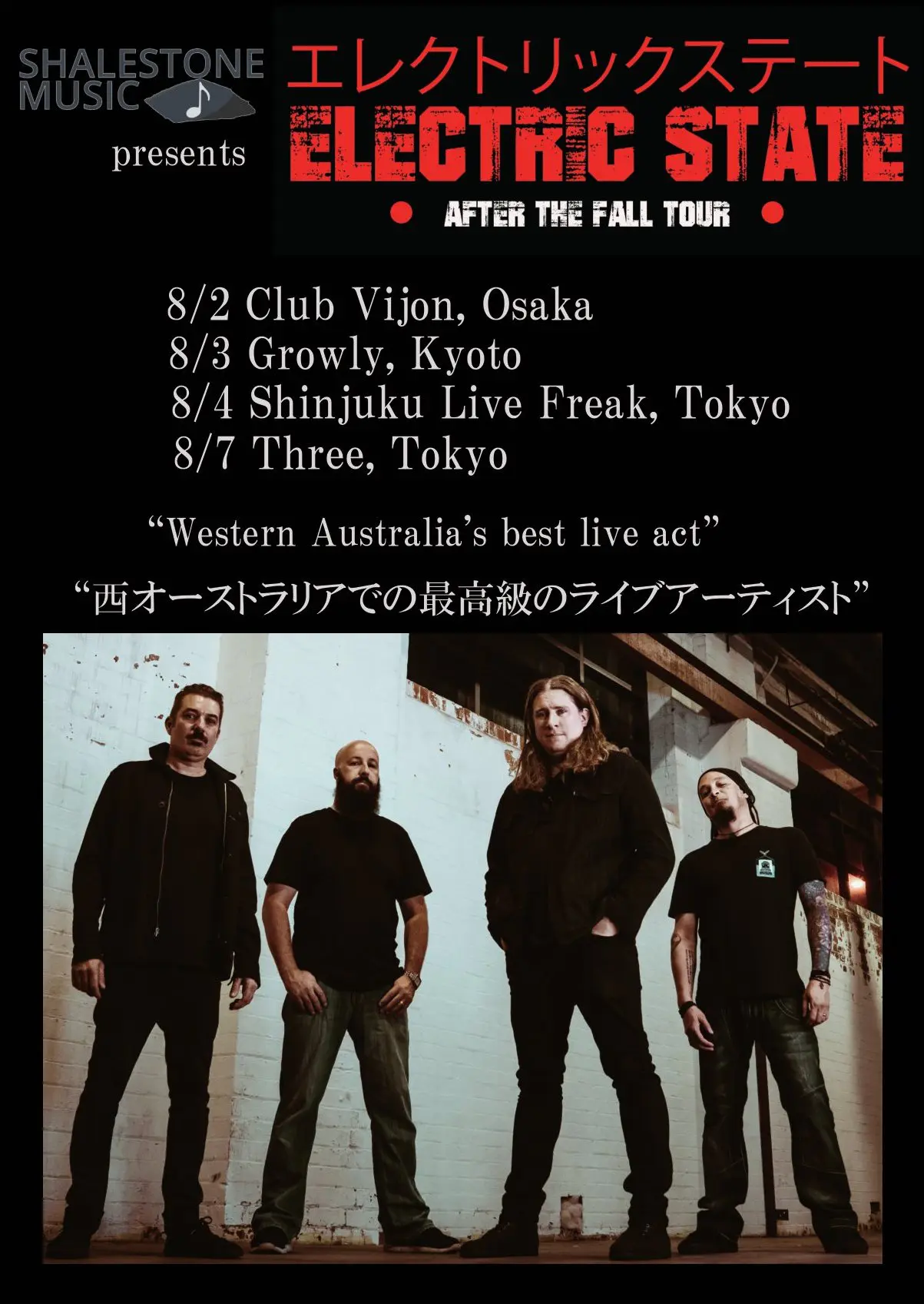 Thunderous Perth-born quartet Electric State have established themselves as one of the hardest rocking bands in Australia today. Channeling the chug of heavy metal along with the attitude of ‘90s grunge, the group is a force both recorded and live. After shows in Osaka and Kyoto, Electric State will bring its energy to Tokyo on August 7, at Shimokitazawa Three.