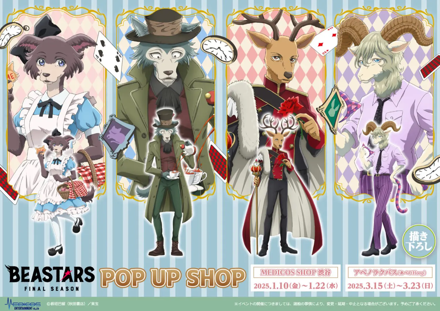 Everyone’s favorite animal-themed anime is back! And to celebrate, a Beastars pop-up store is coming. The merchandise featured at the store is themed after Alice in Wonderland and will feature favorite characters such as Legoshi and Juno dressed up as The Mad Hatter and Alice, respectively. Stop by to pick up character acrylic stands, badges and prints. For every ¥1,000 spent, fans will receive a random card with a character on it.