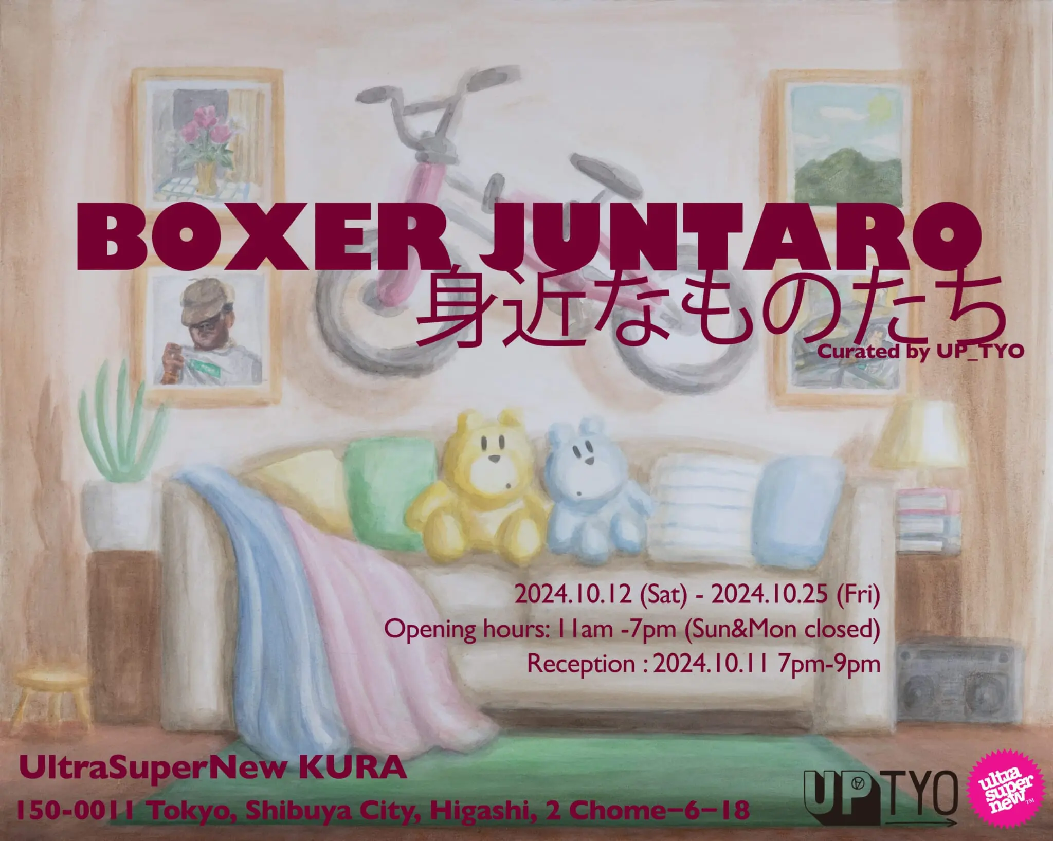 In this exhibition, held at the new gallery space of Ultra Super New Shibuya, Boxer Juntaro expresses the various emotions and energies latent in ordinary moments of daily life. The exhibit also explores the meaning of abundance that extends into the home and everyday spaces, offering viewers a new perspective. Soft brush strokes and mixed media techniques create a sense of familiarity and a unique depth of texture.