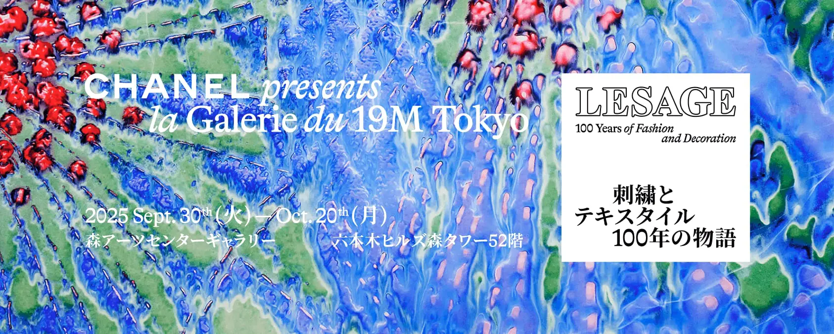 “Lesage: 100 Years of Fashion and Decoration” will showcase a retrospective celebrating the 100th anniversary of the embroidery and tweed weaving house, Lesage. The exhibition will be held at the Mori Arts Center Gallery on the 52nd floor of the Roppongi Hills Mori Tower. Founded in 1924, Lesage has been renowned for its mastery in embroidery and textiles, combining weaving with sequins, beads and metallic threads for luxurious tweeds that have become synonymous with the Chanel brand.